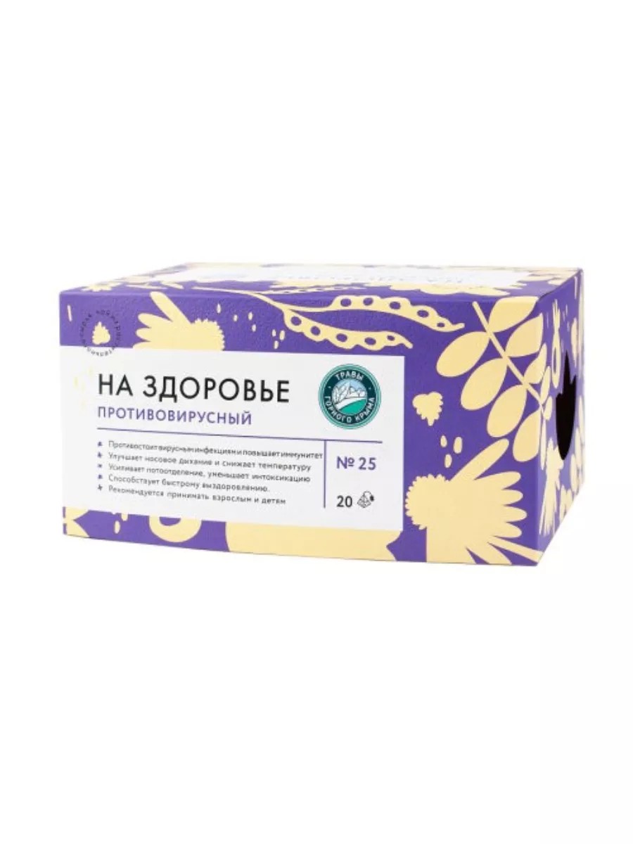 Чайный напиток На Здоровье "Противовирусный" №25 восстанавливает защитные силы организма и способствует быстрому выздоровлению, 50 гр (20 пирамидок)Действие:Сбор оказывает мощное противовирусное действие при гриппе, ОРВИ, активизирует иммунитет. Травы, входящие в состав уменьшают проявление воспалительного процесса, борются с инфекцией и уменьшают количество слизи. Сбор является источником витаминов и биологически активных веществ, которые ускоряют выздоровление, заставляют организм эффективнее бороться с вирусами. Фиточай усиливает потоотделение, уменьшает интоксикацию, восстанавливает защитные силы организма и способствует быстрому выздоровлению. Фитосбор особенно полезен в холодное время года. Чай рекомендуется принимать взрослым и детям.Назначение — усиливает потоотделение, уменьшает интоксикацию, восстанавливает защитные силы организма и способствует быстрому выздоровлению.Состав:ежевики листья, мята перечная, чабрец, розмарин, полынь горькая, фенхеля плоды, лист шалфеяПротивопоказания: индивидуальная непереносимость компонентовСпособ применения:Россыпь:1 столовую ложку смеси залить стаканом (200 мл) крутого кипятка, дать настояться 5-10 минут, процедить. Рекомендуется употреблять взрослым полстакана теплого фиточая за 15 минут до еды 2-3 раза в день в течение 3-х недель.Пирамидка: возьмите пирамидку, залейте стаканом кипятка, дать настояться 30 минут. Рекомендуется применять за 15 минут до еды 2-3 раза в день в течение 3-х недель. При необходимости курс повторять 2-3 раза в год.Продукция торговой марки «Травы Горного Крыма» производится в экологически чистом горном районе, у подножия горы Ай-Петри. Наше предприятие создано в 2004 году, занимается сбором и фасовкой трав уже более 10 лет. Мы имеем все необходимое современное оборудование и производственные площади для фасовки и хранения травяных чаев. Для изготовления сырья и приготовления сборов используется только ручной труд и экологически чистые технологии.Продукция сертифицирована в соответствии требованиям технических регламентов Евразийского экономического союза.
