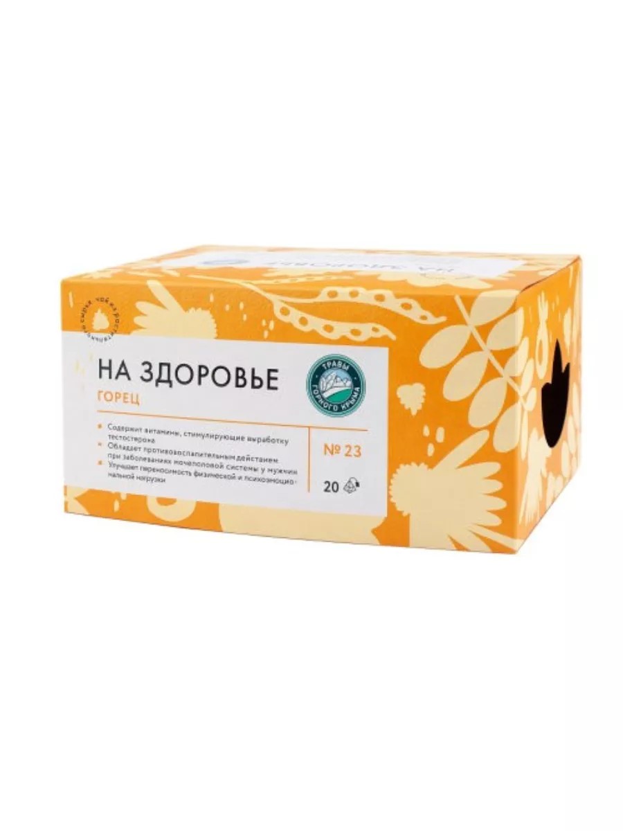 Чайный напиток На Здоровье "Горец" №23 для мужской силы, 50 гр (20 пирамидок)Состав — корень пиона, корень солодки, корень девясила, цветки ноготков, иван-чай, зверобой, лист кизила, лист грецкого ореха, лист ежевики, лист лещиныМужчины, проживающие в горной местности, славятся своей физической выносливостью и исключительным успехом у представительниц прекрасного пола. Один из секретов их активности состоит в постоянном употреблении отваров растений, произрастающих в горах.Фиточай содержат витамины, микроэлементы и вещества, стимулирующие выработку полового гормона тестостерона. Сочетание компонентов сбора положительным образов влияет на мужскую половую сферу при одновременной активации сердечно-сосудистой системы.Действие:Сбор обладает противовоспалительным, антибактериальным и антиспазматическим действием при заболеваниях мочеполовой системы у мужчин.Травяной чай, оказывая регулирующее и восстанавливающее действие, полезен при дисфункции половой системы и простатитах.Регулярный прием фиточая улучшает переносимость физической и психоэмоциональной нагрузки и является источником молодости и активного долголетия.Способ применения:Россыпь: 1 столовую ложку сбора залить 1 стаканом кипятка, настаивать 5-10 минут, процедить. Рекомендуется пить полстакана теплого сбора 2-3 раза в день за 15 минут до еды в течение 3-ех недель. При необходимости курс повторять 2-3 раза в год.Пирамидка: возьмите пирамидку, залейте стаканом кипятка, дать настояться 30 минут. Рекомендуется применять за 15 минут до еды 2-3 раза в день в течение 3-х недель. При необходимости курс повторять 2-3 раза в год.Противопоказания: индивидуальная непереносимость компонентовПродукция торговой марки «Травы Горного Крыма» производится в экологически чистом горном районе, у подножия горы Ай-Петри. Наше предприятие создано в 2004 году, занимается сбором и фасовкой трав уже более 10 лет. Мы имеем все необходимое современное оборудование и производственные площади для фасовки и хранения травяных чаев. Для изготовления сырья и приготовления сборов используется только ручной труд и экологически чистые технологии.Продукция сертифицирована в соответствии требованиям технических регламентов Евразийского экономического союза.
