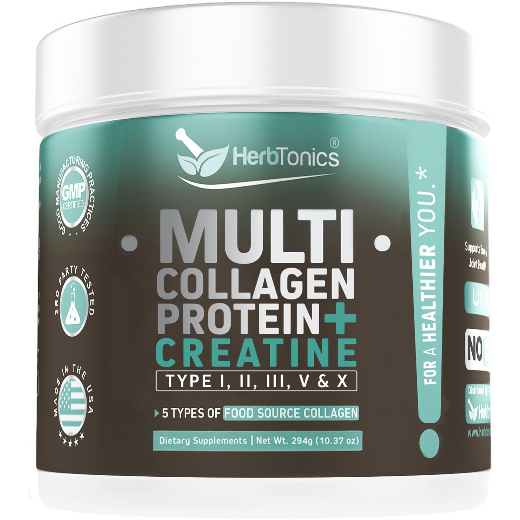 Herbtonics Creatine Monohydrate + Multi Collagen Protein Powder 10g Per Serving | Grass-Fed Hydrolyzed Collagen Peptides (Type 1 2 3 5 10) for Lean Muscle Growth Recovery and Energy | Unflavored