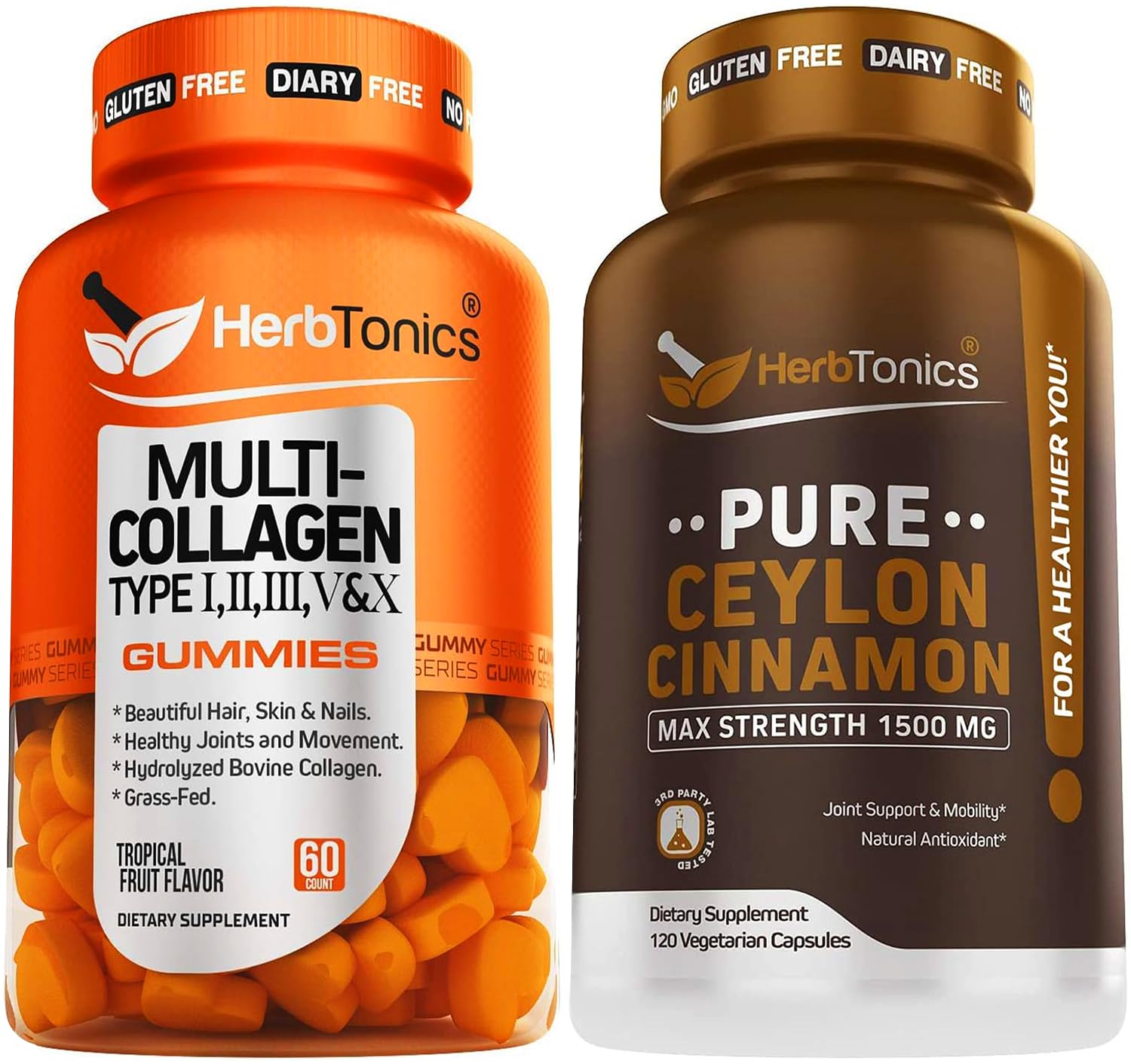 Herbtonics Multi Collagen Gummies Type 1 2 3 5 & 10 with Biotin for Hair Growth Skin Nails - Premium Ceylon Cinnamon Capsules - Effective Cinnamon Pills for Enhanced Well-Being - 1500mg Cinnamon Sup