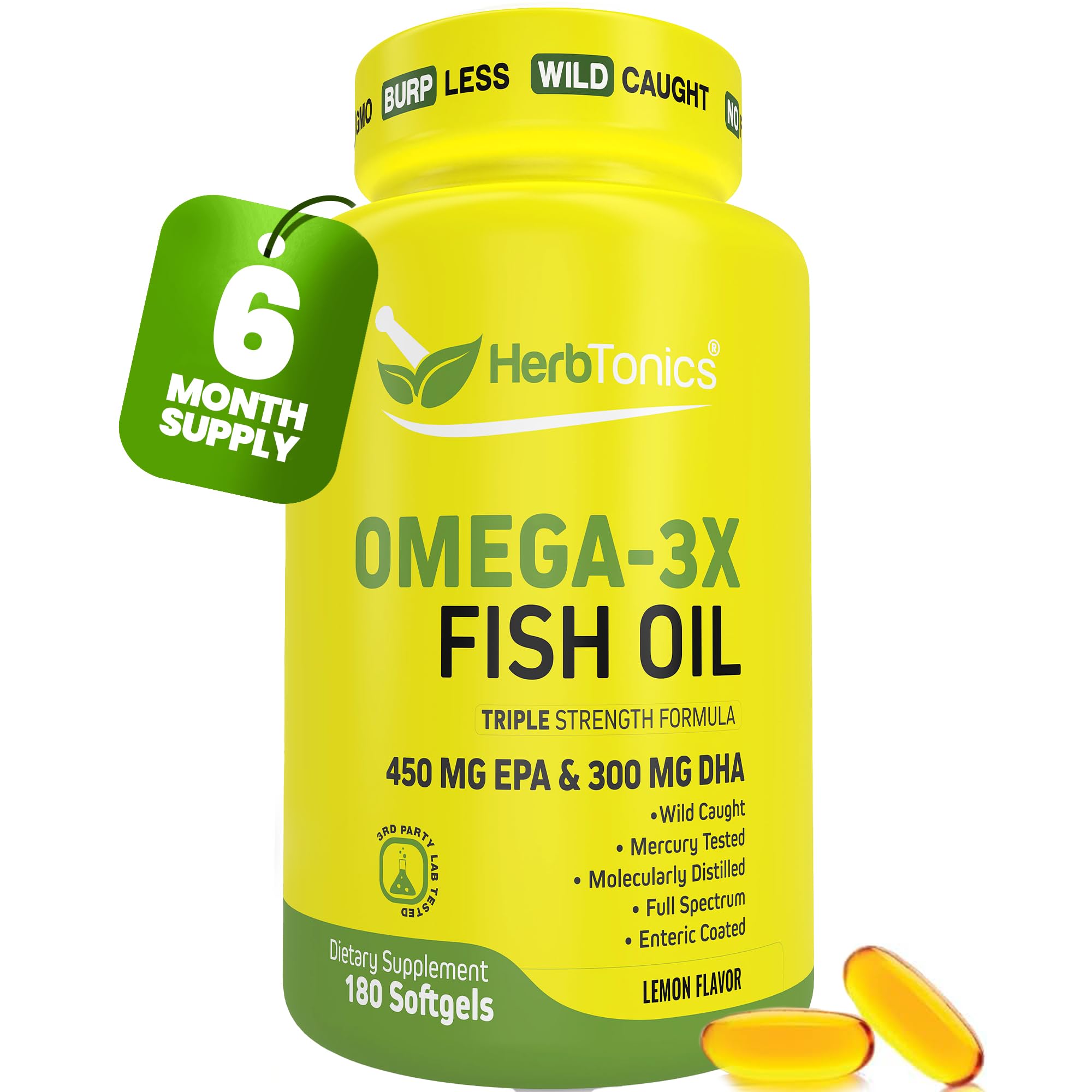 EXCEPTIONAL VALUE - UP TO 6 MONTH SUPPLY: Each bottle contains 180 high-absorption softgels. Take 3 daily for maximum therapeutic benefits (60-day 2-month supply) or 1 daily for maintenance (180-day 6-month supply). Quality checked in the USA, Non-GMO, and Gluten-Free. (Packaging May Vary). COMPREHENSIVE HEALTH SUPPORT: Promote heart wellness, enhance cognitive function, support joint mobility and comfort, and boost your immune defenses. Our high EPA DHA fish oil is your daily partner for overall vitality. ULTRA-PURIFIED WILD CAUGHT: Sourced from fresh, wild-caught fish and molecularly distilled for exceptional purity. Our fish oil supplement is rigorously tested to remove heavy metals toxins, delivering a clean and safe Omega-3 you can trust for daily wellness. ENJOY THE BENEFITS, NOT THE BURPS: Our advanced burpless formula with a refreshing natural lemon flavor ensures you get your daily Omega-3s without the unpleasant fishy aftertaste or burps. Easy-to-swallow softgels for a comfortable daily experience. MAXIMUM POTENCY FOR OPTIMAL RESULTS: Experience triple strength support with 1250mg of Omega-3s per serving, featuring an impressive 450mg EPA 300mg DHA. Fuel your heart, brain, joints, and immune system with our concentrated wild caught fish oil.