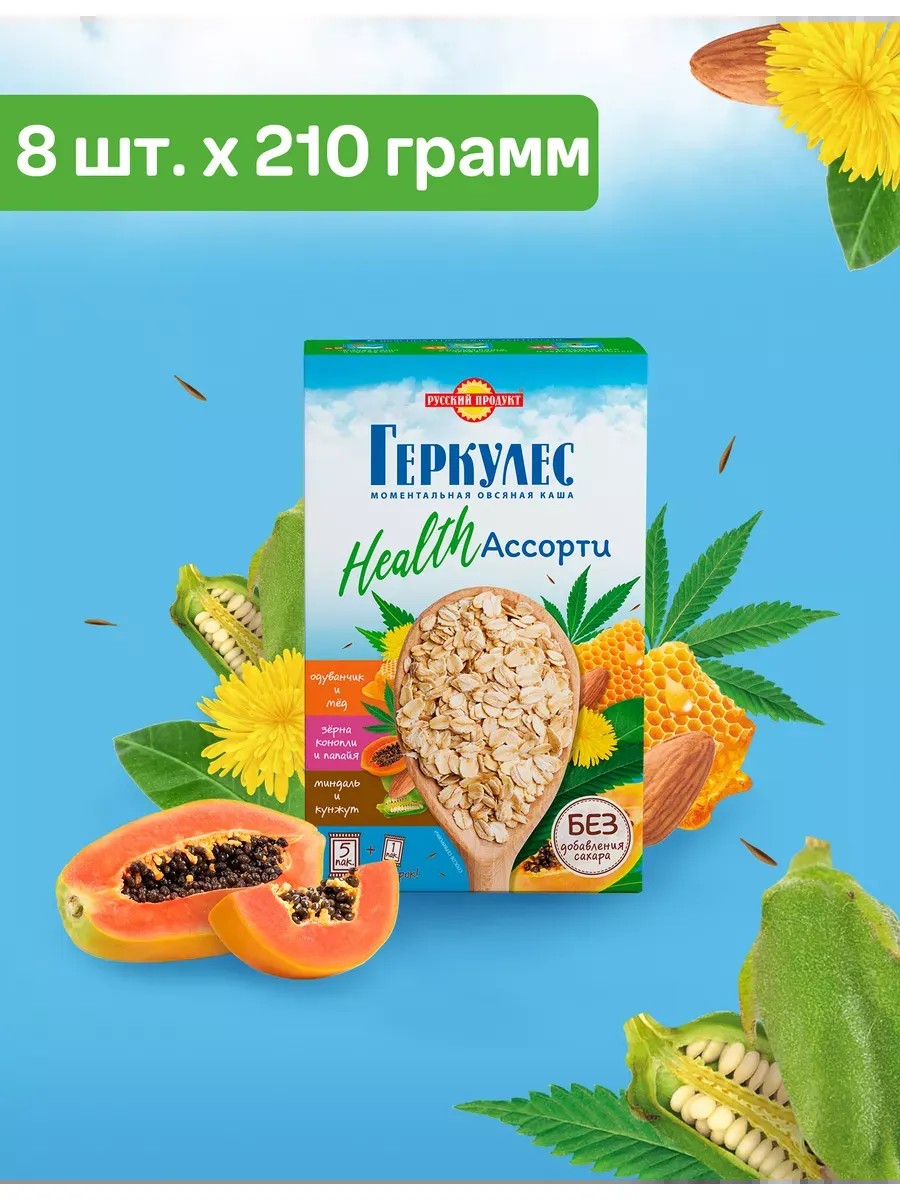 Hercules Health Assorted Instant Oatmeal Porridge, packed with healthy ingredients and available in favorite flavors like almond and sesame, dandelion and honey, and papaya and hemp, from Russkiy Produkt is a 100% natural product made from a blend of carefully selected millet flakes and berry and fruit pieces for a wholesome and delicious meal! Delicately processed grains preserve all the healing properties of a natural product, providing a maximum of beneficial microelements, minerals, and vitamins, as well as dietary fiber. Pour hot water or milk over the oatmeal. This delicious porridge is a healthy breakfast for those who lead a healthy lifestyle and adhere to a proper diet, and for weight loss, for both men and women. This easy-to-prepare Lenten dish will complement the diets of adults, adolescents, and children, and is suitable for vegans and vegetarians. Oatmeal is a low-calorie cereal that provides a long-lasting feeling of satiety and unquestionable health benefits: it normalizes digestion, maintains high energy levels, stamina, and performance, detoxifies, strengthens the immune system, and improves sleep. Regular consumption of this healthy product normalizes blood sugar and cholesterol levels, reduces the risk of cardiovascular disease, normalizes the endocrine system, and improves metabolism. A favorite oatmeal is a good choice for a light yet filling snack at any time of day: morning, afternoon, or evening at home, or at the dacha during the warm summer season. It's the secret to your excellent mood, energy, and well-being. This food product comes in a set of 8 pieces, weighing 210 grams each. If desired, it can be used for baking cookies, pies, crispbreads, and other baked goods, as well as for making kissels and decoctions for dietary nutrition. The brand's line also includes sets with varying numbers of packs in a convenient cardboard storage box and various types of processed oats, so you can choose the perfect packaging - packaging and type of flakes. Made in Russia. We have promotions and sales, you can buy our products as gifts at a discount! Ingredients: With almonds and sesame: Oat flakes, crushed roasted almonds, sesame flour, natural vanilla flavor, sucralose. With dandelion and honey: Oat flakes, honey granules (honey, glucose), dandelion extract, natural vanilla flavor, sucralose. With papaya and hemp seeds: Oat flakes, dried papaya, hemp seeds, natural vanilla flavor, sucralose. The production process uses: gluten, dairy products, nuts, peanuts, celery, mustard, egg products, soy.