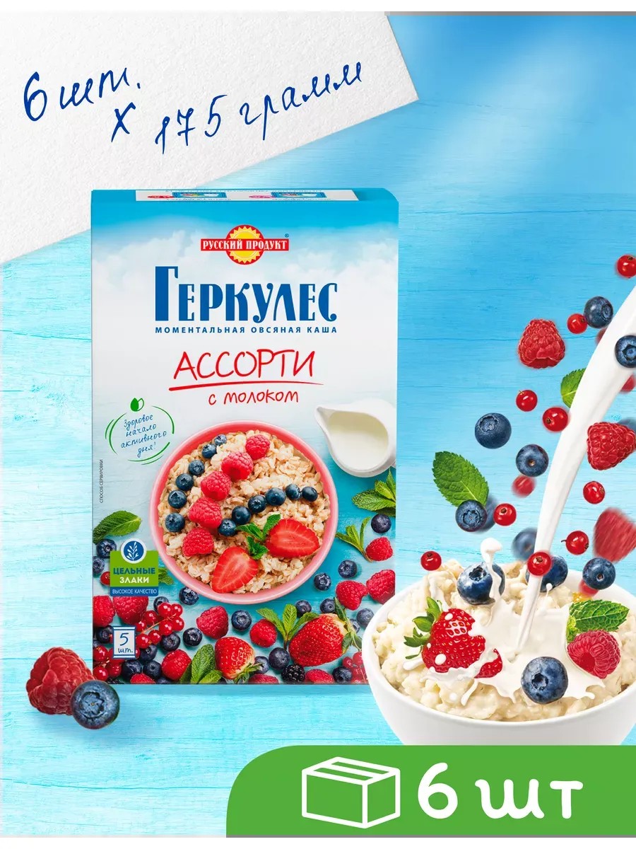 Каша овсяная моментальная Геркулес Ассорти с содержанием полезных компонентов, всеми любимые классические вкусы – клубники с молоком и малины с молоком от компании «Русский продукт» - это 100% натуральный продукт из смеси тщательно отобранных хлопьев и кусочков ягод и фруктов для получения благотворного и вкусного блюда! Зерно с деликатной технологией обработки сохраняют все целебные свойства натурального продукта, максимум полезных микроэлементов, минералов и витаминов, пищевого волокна в виде клетчатки. Овсяные хлопья необходимо залить горячей водой или молоком. Вкусная каша из хлопьев - полезный завтрак для людей, ведущих здоровый образ жизни и придерживающихся правильного питания, для похудения женщин и мужчин. Простое в приготовлении постное блюдо дополнит рацион взрослых, подростков - девушек и парней, детский рацион мальчиков и девочек, подойдет для веганов и вегетарианцев. Овсяные хлопья - низкокалорийная каша, которая радует длительным чувством сытости, безусловной пользой для организма: нормализацией процессов пищеварения, поддержанием высокого уровня энергии, выносливости и работоспособности, очищением от токсинов, укреплением иммунитета, улучшением сна. Регулярное употребление полезного продукта нормализует количество сахара и холестерина в крови, снижает риск сердечно-сосудистых заболеваний, приводит в норму работу эндокринной системы и улучшает обмен веществ. Любимая овсяная каша - хороший выбор для легкого, но сытного перекуса в любое время приема пищи: утром, днем или вечером дома, на даче в теплый летний сезон, секрет вашего отличного настроения, бодрости и хорошего самочувствия. Пищевой продукт поставляется в комплекте из 6 шт по 175 грамм каждая. При желании можно использовать для выпечки печенья, пирогов, хлебцев и других хлебобулочных изделий, а также для приготовления киселей, отваров для диетического питания. В линейке бренда также представлены наборы с разным количеством пачек в удобной картонной коробке для хранения и различными видами обработанного овса, чтобы вы могли выбрать идеально подходящую вам фасовку - упаковку и тип хлопьев. Произведено в России. У нас есть акции и распродажи, вы можете купить наши товары в подарок со скидкой!