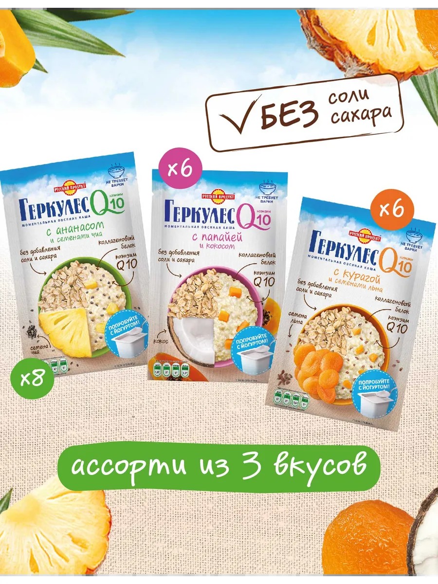 Овсяная каша быстрого приготовления Геркулес Q10 Супер Ассорти — это идеальный выбор для тех, кто ценит здоровое и вкусное питание. В каждой упаковке весом 700 г вы найдете 20 порций по 35 г с разнообразными и всеми любимыми вкусами: с ананасом и семенами чиа, с курагой и семенами льна, с папайей и кокосом.