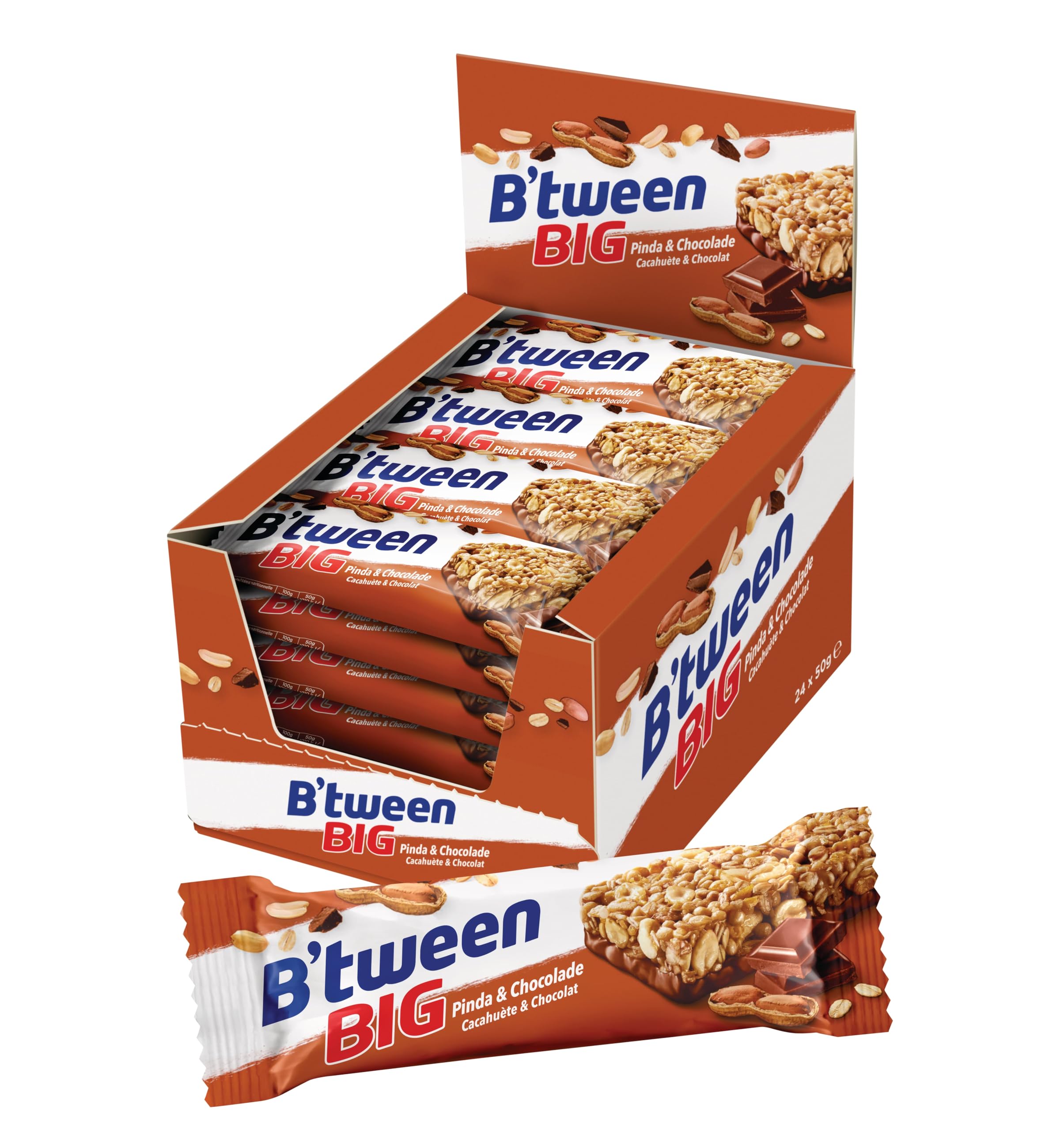 Whether you're on the go, at work, or simply looking for a tasty snack, B'tween BIG Milk Chocolate Muesli Bars offer the perfect solution. Discover the irresistible taste of B'tween BIG Milk Chocolate Muesli Bars in this value pack of 24 bars, each weighing 50 grams. These delicious muesli bars are the ideal snack for milk chocolate lovers and offer an exquisite combination of crunchy cereal and smooth, creamy milk chocolate. This value pack is perfect for families, offices, or simply for those who like to keep a supply of their favorite muesli bars on hand. Each bar is individually wrapped, making them convenient for lunches, snacks, or as an energy boost during sports. Treat your taste buds to this delicious combination of crunch and sweetness. Order B'tween BIG Milk Chocolate Muesli Bars now and enjoy the convenience and delicious taste of this irresistible treat! INGREDIENTS Roasted peanuts (24 ), milk chocolate (20 ) [sugar, cocoa mass , cocoa butter , skimmed milk powder, milk fat, emulsifier (ammonium phosphatides, polyglycerol polyricinoleate)], glucose-fructose syrup, whole grain flakes (oats 12 , wheat 1.8 ), crispy cereal (wheat flour, sugar, rice flour, corn flour, barley malt extract, salt, caramelized sugar syrup), glucose syrup, sugar, coconut oil, corn flakes (corn, salt, barley malt extract), honey, salt, caramelized sugar syrup, emulsifiers (lecithins). May contain other nuts. INSTRUCTIONS FOR USE Ready to eat from the package See moreB'tween BIG Barres de Muesli Arachide Chocolat - 24 pièces x 50 grammes - Pack AvantageDESCRIPTION DU PRODUIT DESCRIPTION DU PRODUIT Que vous soyez en déplacement, au travail ou simplement en quête d'une collation savoureuse, les barres de muesli B'tween BIG au chocolat au lait offrent la solution parfaite. Découvrez le goût irrésistible des barres de muesli B'tween BIG au chocolat au lait dans cet emballage avantageux de 24 pièces, chacune pesant 50 grammes. Ces délicieuses barres de muesli sont la collation idéale pour les amateurs de chocolat au lait et offrent une combinaison exquise de céréales croustillantes et de chocolat au lait doux et crémeux. Cet emballage avantageux est parfait pour les familles, les bureaux ou simplement pour ceux qui aiment avoir une réserve de leurs barres de muesli préférées à portée de main. Chaque barre est emballée individuellement, ce qui les rend pratiques pour les déjeuners, les en-cas ou comme boost d'énergie pendant le sport. Régalez vos papilles avec cette délicieuse combinaison de croquant et de douceur. Commandez dès maintenant les barres de muesli B'tween BIG au chocolat au lait et profitez de la commodité et du goût délicieux de cette friandise irrésistible! INGRÉDIENTS Cacahuètes grillées (24 ), chocolat au lait (20 ) [sucre, masse de cacao , beurre de cacao , lait écrémé en poudre, graisse de lait, émulsifiant (phosphatides d'ammonium, polyglycérol polyricinoleate)], sirop de glucose et fructose, flocons de céréales complètes (avoine 12 , blé 1,8 ), céréales croustillantes (farine de blé, sucre, farine de riz, farine de maïs, extrait de malt d'orge, sel, sirop de sucre caramélisé), sirop de glucose, sucre, huile de coco, flocons de maïs (maïs, sel, extrait de malt d'orge), du miel, du sel, du sirop de sucre caramélisé, des émulsifiants (lécithines). Peut contenir d'autres noix. MODE D'EMPLOI Prêt à manger du paquet Voir plus