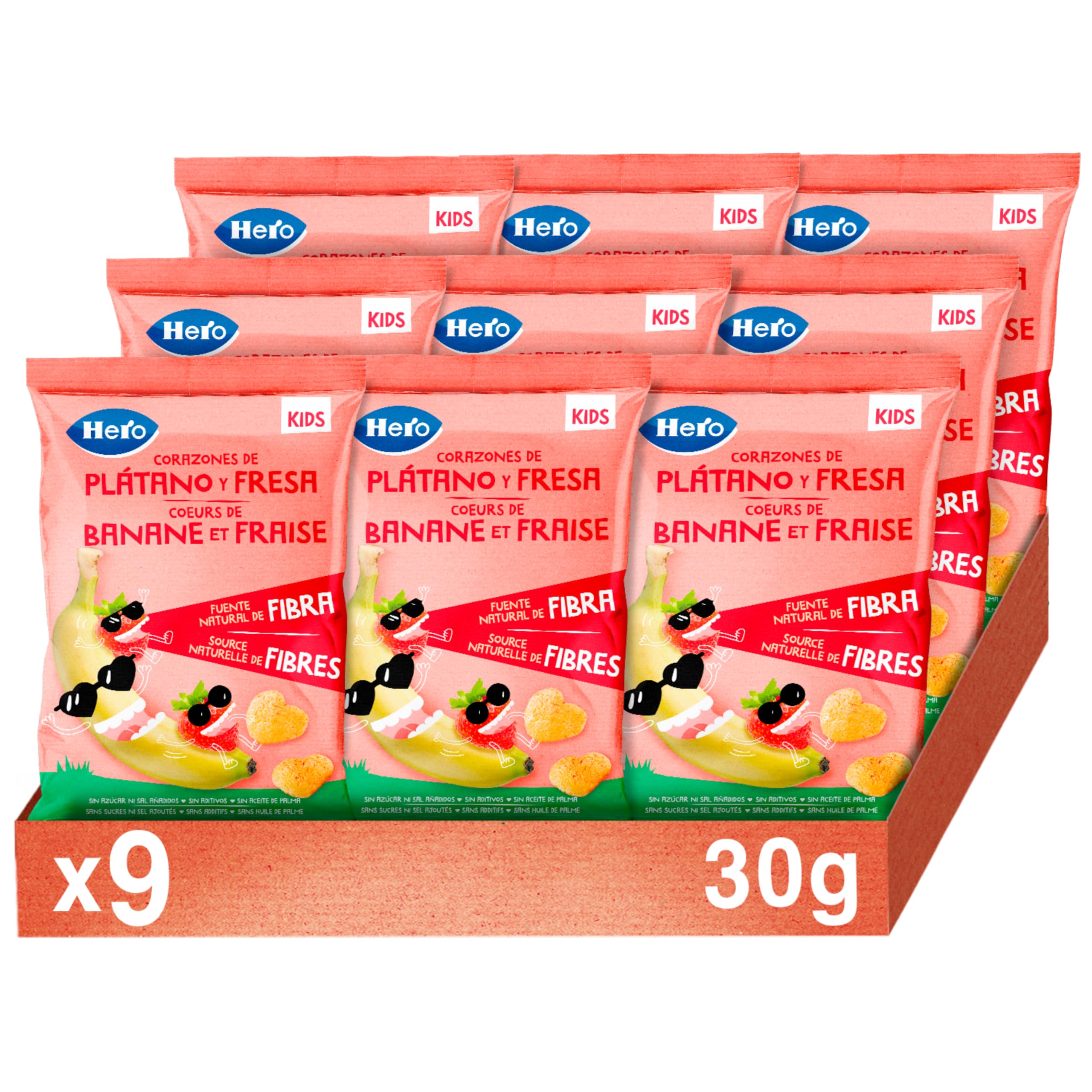 : Discover Hero Snacks Banana and Strawberry Hearts, a healthy and delicious snack for children. Presented in a pack of nine 30g pouches, these fruit hearts are designed to offer a balanced and natural diet. Made without added sugar or salt, these snacks are perfect for parents concerned about their children's health. These banana and strawberry hearts are a natural source of fiber, aiding digestion and contributing to a healthy diet. Free from palm oil and additives, they guarantee a pure and natural snack, without unwanted ingredients. In accordance with Annex II of Regulation (EU) No. 1169 2011, they contain no undeclared allergens, ensuring maximum food safety. The convenient 30g pouch size makes them easy to take anywhere, whether to school, on outings, or for a quick snack at home. Offer your children a healthy alternative to sugary and salty snacks by incorporating more fruit into their daily diet. With Hero Snacks Banana and Strawberry Hearts, you can be sure you're providing your children with a delicious and healthy snack that supports their growth and development. Choose Hero for quality snacks that are good for your children's health and the environment. Ingredients: Corn semolina (70 ), banana powder (16.7 ), sunflower oil (10 ), and strawberry powder (3.3 ). May contain traces of gluten, soy, and milk. Instructions: Open the bag and enjoy the snack anytime. See moreCONVENIENT AND PORTABLE FORMAT: Each 30g pack is ideal for on-the-go snacking. Slip these healthy snacks into your children's backpacks for a nutritious snack at school, on outings, or at home, without compromising on quality or freshness. NO UNDECLARED ALLERGENS: Compliant with Annex II of Regulation (EU) No 1169 2011, these snacks contain no undeclared allergens, ensuring maximum food safety. They may contain traces of soy, milk, or nuts. NO PALM OIL OR ADDITIVES: Our banana and strawberry hearts are made without palm oil or additives, guaranteeing a natural and pure snack for children. Enjoy all the goodness of fruit without unwanted ingredients. NO ADDED SUGAR OR SALT: These fruit hearts contain no added sugar or salt, making for a healthy and delicious snack. Give your children a healthy alternative to sugary and salty snacks, promoting good eating habits. HEALTHY SNACK FOR KIDS: Hero Banana and Strawberry Hearts are a perfect snack for little ones, with no added sugar or salt, ensuring a balanced and natural diet for your children. Enjoy a source of fiber in every bite.Description du produit Découvrez les Hero Snacks Coeurs de Banane et Fraise, une collation saine et savoureuse pour les enfants. Présentés en lot de 9 sachets de 30 g, ces coeurs de fruits sont conçus pour offrir une alimentation équilibrée et naturelle. Fabriqués sans sucres ni sel ajoutés, ces snacks sont parfaits pour les parents soucieux de la santé de leurs enfants. Ces coeurs de banane et fraise sont une source naturelle de fibres, aidant à la digestion et contribuant à une alimentation saine. Sans huile de palme et sans additifs, ils garantissent une collation pure et naturelle, sans ingrédients indésirables. En conformité avec l'annexe II du Règlement (UE) n 1169 2011, ils ne contiennent aucune substance allergène non déclarée, assurant ainsi une sécurité alimentaire maximale. Le format pratique des sachets de 30 g permet de les emporter facilement partout, que ce soit à l'école, en sortie ou pour une collation rapide à la maison. Offrez à vos enfants une alternative saine aux collations sucrées et salées, en intégrant plus de fruits dans leur alimentation quotidienne. Avec les Hero Snacks Coeurs de Banane et Fraise, vous pouvez être assuré de fournir à vos enfants une collation délicieuse et saine qui soutient leur croissance et leur développement. Choisissez Hero pour des collations de qualité, respectueuses de la santé de vos enfants et de l'environnement. Ingrédients Semoule de maïs (70 ), poudre de banane (16,7 ), huile de tournesol (10 ) et poudre de fraise (3,3 ). Peut contenir des traces de gluten, de soja et de lait. P.when('A').execute(function(A) { A.on('a:expander:toggle_description:toggle:collapse', function(data) { window.scroll(0, data.expander. expander[0].offsetTop-100) }) }) Mode d'emploi Ouvrez le sac et profitez de la collation à tout moment. Voir plusFORMAT PRATIQUE ET PORTABLE: Chaque paquet de 30 g est idéal pour les déplacements. Glissez ces snacks sains dans le sac à dos de vos enfants pour une collation nutritive à l'école, en sortie ou à la maison, sans compromis sur la qualité ou la fraîcheur. AUCUN ALLERGÈNE NON DÉCLARÉ: Conformes à l'annexe II du Règlement (UE) n 1169 2011, ces snacks ne contiennent aucune substance allergène non déclarée, offrant une sécurité alimentaire maximale. Ils peuvent contenir des traces de soja, lait ou fruits à coque. SANS HUILE DE PALME NI ADDITIFS: Nos coeurs de banane et fraise sont fabriqués sans huile de palme et sans additifs, garantissant une collation naturelle et pure pour les enfants. Profitez de tous les bienfaits des fruits sans ingrédients indésirables. SANS SUCRES NI SEL AJOUTÉS: Ces coeurs de fruits ne contiennent ni sucres ni sel ajoutés, permettant une collation saine et délicieuse. Offrez à vos enfants une alternative saine aux snacks sucrés et salés, favorisant de bonnes habitudes alimentaires. SNACK SAIN POUR ENFANTS: Les coeurs de banane et fraise Hero sont une collation parfaite pour les petits, sans sucres ni sel ajoutés, assurant une alimentation équilibrée et naturelle pour vos enfants. Profitez d'une source de fibres dans chaque bouchée.Hero - Snacks Coeurs de Banane et Fraise, Sans Sucres ni Sel Ajoutés, Sans Gluten, Sans Huile de Palme, Sans Additifs - Lot 9 x 30 g