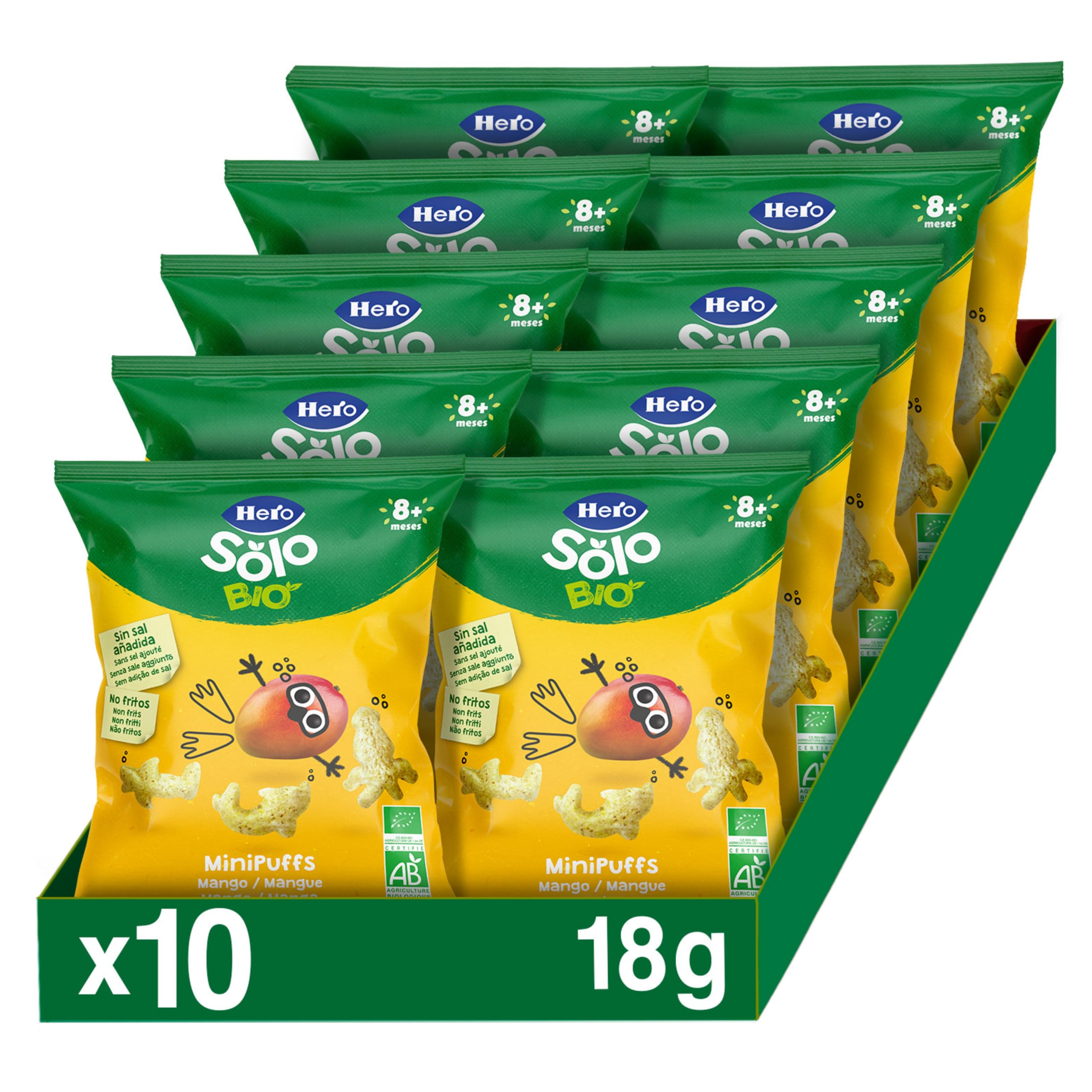 : This snack helps your baby become familiar with different textures. It's suitable for babies from 8 months old and, best of all, it's very easy to carry, whether in a bag or a backpack. Hero Baby Quality: A commitment to the development of healthy babies. At Hero, we're by your side to offer you the best to nourish and care for your child throughout their early years. We are committed to producing high-quality food you can trust, as our selected ingredients undergo more than 530 tests before being included in our products. Our goal is to offer the best for your baby, every day. To achieve this, we follow our "Baby Quality" protocol, a set of strict rules and quality control guidelines that allow us to produce optimal and healthy food, just like you would at home. Ingredients from organic farming: Whole wheat flour (30 ), buckwheat flour (19 ), wheat flour (19 ), corn semolina (19 ), sunflower oil (7 ), mango powder (4.8 ), banana powder (1.2 ), thiamine (vitamin B1). May contain traces of soy, milk and or nuts.100 Organic and Natural: Our snacks are made with 100 organic ingredients, with NO additives, NO added salt or sugar, and NO palm oil. Suitable for children 8 months and older. TAKE THEM WHEREVER YOU WANT: The convenient packaging is perfect for taking to school, on the go, or anywhere you like, without needing to refrigerate. This children's snack is made with 100 organic ingredients and no added sugar. Suitable for babies from 8 months.Description du produit Ce snack aide votre bébé à se familiariser avec différentes textures, il est adapté aux bébés à partir de 8 mois et, le meilleur de tout, il est très facile à transporter, que ce soit dans un sac ou un sac à dos. Qualité Hero Baby : Un engagement pour le développement de bébés en bonne santé. Chez Hero, nous sommes à vos côtés pour vous offrir le meilleur afin de nourrir et prendre soin de votre enfant tout au long de son enfance. Nous nous engageons à produire des aliments de haute qualité en lesquels vous pouvez avoir confiance, car nos ingrédients sélectionnés passent plus de 530 tests avant d'intégrer nos produits. Notre objectif est d'offrir le meilleur à votre bébé, chaque jour. Pour y parvenir, nous suivons notre protocole "Qualité Baby", un ensemble de règles strictes et de lignes directrices en matière de contrôle qualité, qui nous permettent de produire des aliments optimaux et sains, comme vous le feriez à la maison. Ingrédients Ingrédients issus de l'agriculture biologique : Farine de blé complet (30 ), farine de sarr (19 ), farine de blé (19 ), semoule de maïs (19 ), huile de tournesol (7 ), mangue en poudre (4,8 ), banane en poudre (1,2 ), thiamine (vitamine B1). Peut contenir des traces de soja, de lait et ou de fruits à coque.100 biologique et naturel : Nos snacks sont fabriqués avec des ingrédients 100 biologiques, SANS additifs, SANS sel ni sucre ajouté, et SANS huile de palme. Convient aux enfants de 8 mois et plus. EMMENEZ-LES OÙ VOUS VOULEZ : L'emballage pratique est parfait à emporter à l'école, en déplacement ou partout où vous le souhaitez, sans avoir à le conserver au réfrigérateur. Snack pour enfants développé avec des ingrédients 100 biologiques, sans sucres ajoutés. Convient aux bébés à partir de 8 mois.Hero Solo Snack Mini Puff Mango, Gluten Free, Unfried, 8 Months and Up, Box of 10 Packs x 18 g