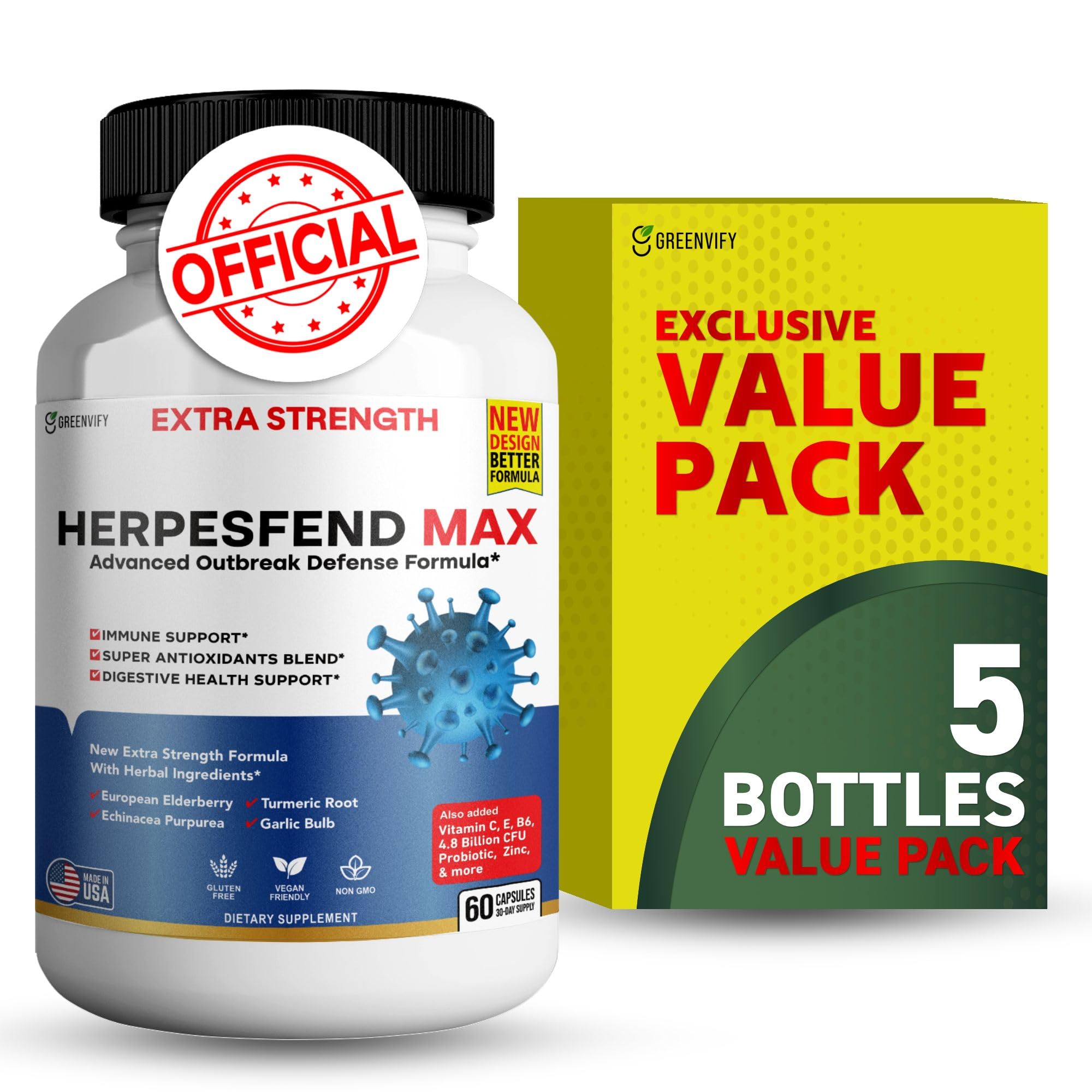 HerpesFend Max Extra Strength Advanced Defense Formula 60 Capsules with Elderberry Echinacea Turmeric Garlic Vitamins and Probiotics (5)