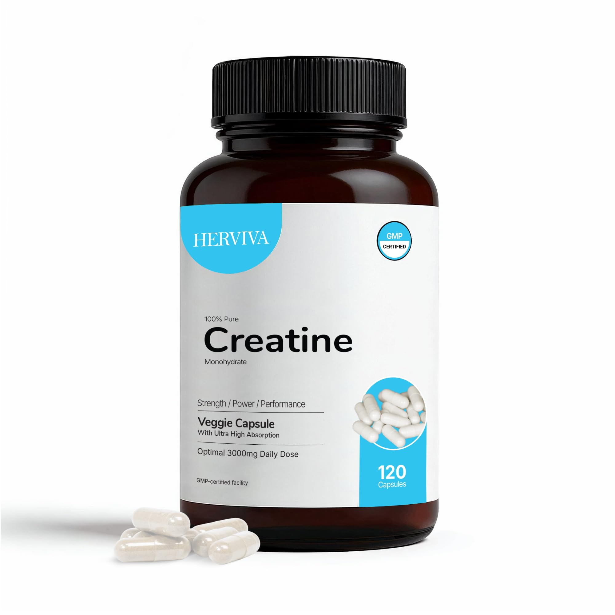 HERVIVA Creatine Monohydrate Capsules 3000mg Creatine Supplement for Muscle Strength Power & Energy Support 120 Easy-to-Swallow Capsules