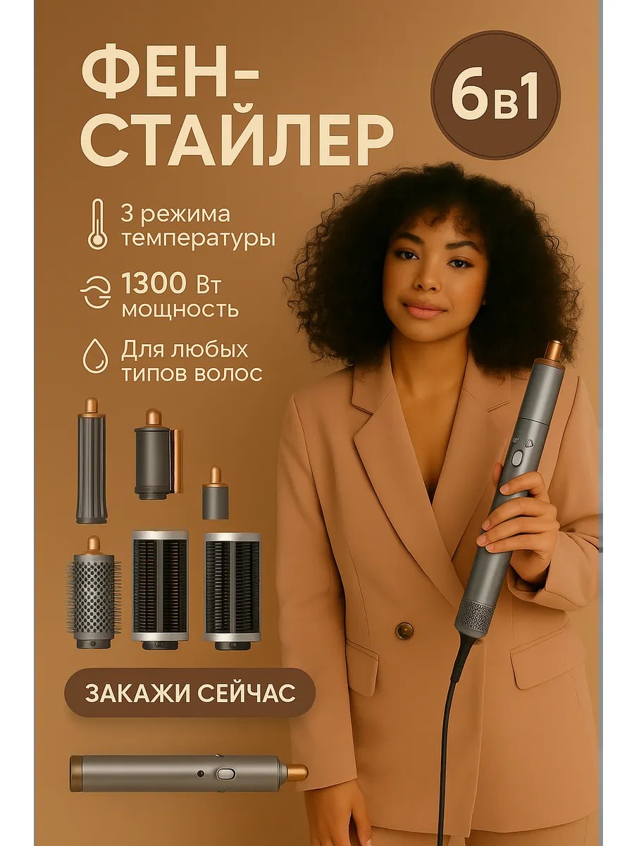 Фен-стайлер 6 в 1 с насадками — универсальный инструмент для создания идеальной укладки дома. Подходит для завивки, выпрямления, создания объема и сушки. 3 режима температуры позволяют выбрать идеальный вариант для любого типа волос. Мощный мотор 1300 Вт обеспечивает быстрый результат без повреждений. В комплект входят 6 сменных насадок: для крупных и мелких локонов, брашинг для объема, выпрямитель и концентратор для сушки. Легкий и удобный, подходит для ежедневного использования.