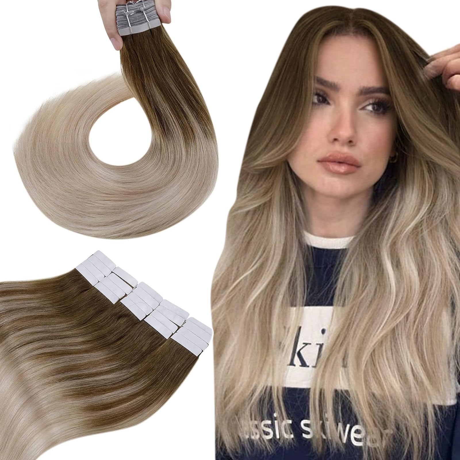 Hetto tape in extensions real hair blond tape real hair extensions smooth hair recovery tape real hair remy tape extensions light brown with dark ash blond to platinum blond balayage #8/16/60 55cm 50g 55 cm 1-2/18/60