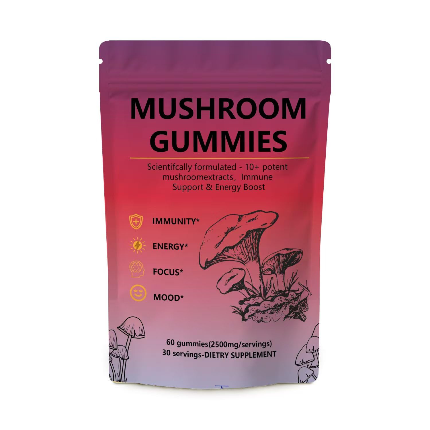 On-the-Go Support – Each bottle contains a 30-day supply (60 gummies), with portable packaging perfect for travel, work, or active lifestyles. Store in a cool, dry place for optimal freshness. Vegan and Non-GMO – Suitable for diverse lifestyles, our formula is vegan-friendly, free from GMOs, and crafted to align with clean dietary preferences. Delicious Easy to Enjoy – Designed for convenience, the fruity-flavored gummies offer a tasty alternative to capsules or powders, making it simple to incorporate functional mushroom benefits into your routine. Natural Wellness Boost – Crafted with pure mushroom extracts and plant-based ingredients, these gummies provide a natural way to support daily energy, focus, and overall vitality without artificial additives. Premium Mushroom Complex – Our gummies harness a powerful blend of 12 functional mushrooms, including Lion's Mane, Reishi, and Cordyceps, carefully formulated to deliver holistic wellness support in every serving.