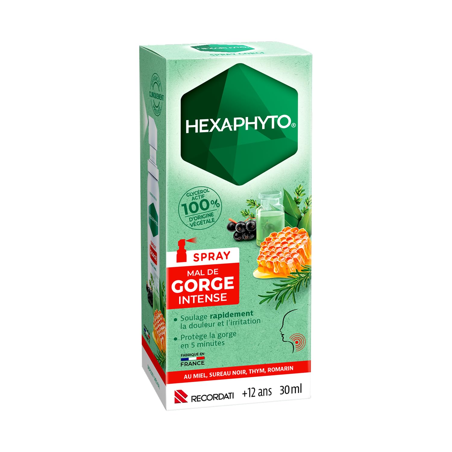 Hexaphyto Spray mal de gorge intense Soulage rapidement la douleur l'irritation Protège la gorge en 5 minutes Hydratant apaisant Goût miel Dès 12 ans Fabriqué en France 30 ml