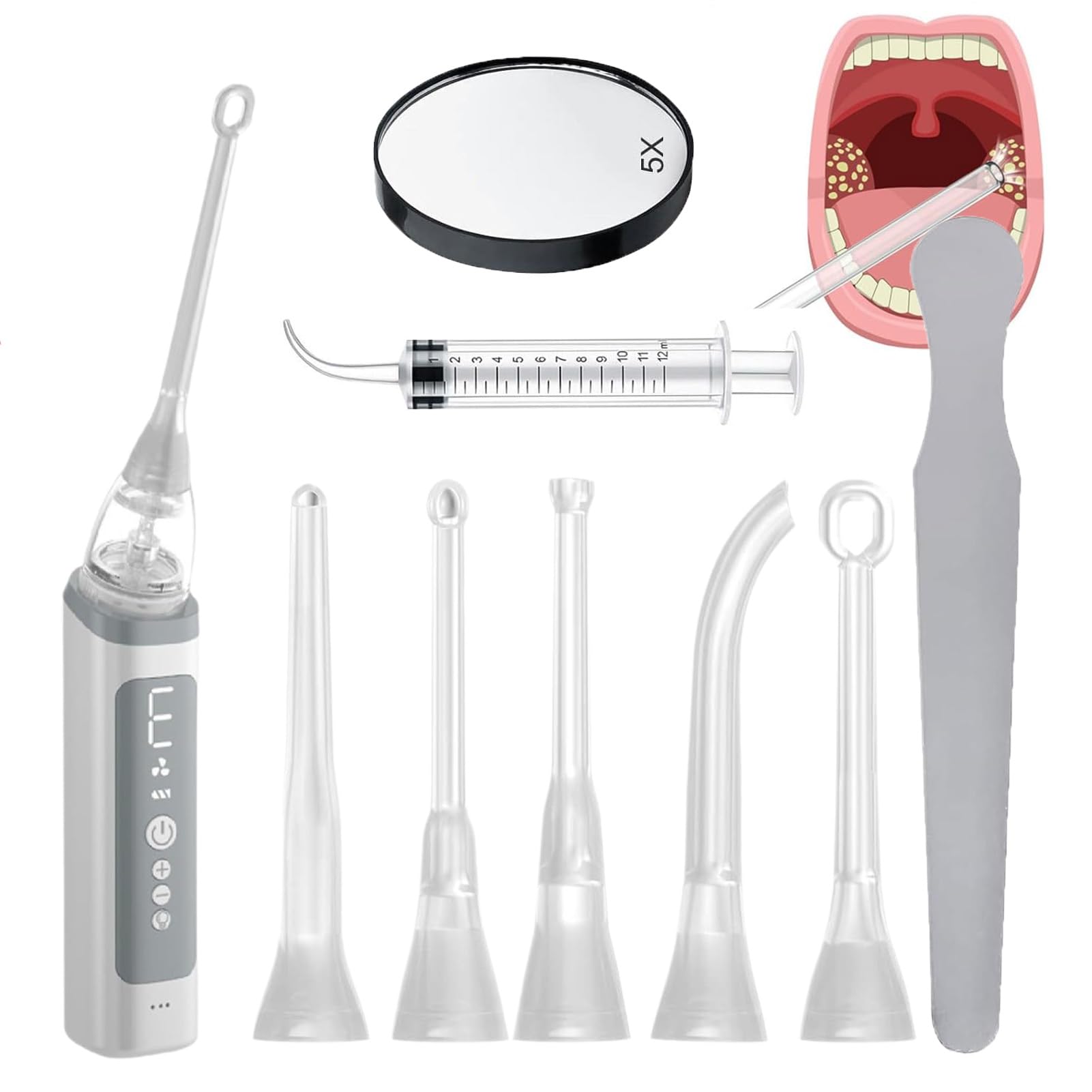 Easy To Clean Design Removable Connections Cleaning and maintenance are a breeze with our tonsil stone removal tool. Detachable connections remove quickly and easily, making cleaning and disinfecting after each use simple. Soft Silicone Tip To Minimum Discomfort: Our tonsil stone removal tool features 5 different shaped silicone tips designed to minimize pain and bleeding during removal. Its gentle and smooth texture reduces irritation and makes the user more comfortable. Optimum Suction Power: After more than 1,000 tests and adjustments, based on the size, sensitivity and location of tonsil stones, 3 gears with the best suction power and highest safety were finally determined. We don't blindly increase gears just to look effective like other products, your oral health is our top priority. Safe Material: The tonsil stone removal tool set is made of stainless steel, sturdy and durable, can clean solid stones, you can choose the right tool according to different situations to facilitate tonsil stone removal, the lightweight features of the tonsil stone removal tool make it perfect for travel and small bathroom. Simple, Fast and Painless: Say goodbye to uncomfortable or unhygienic traditional tonsil removal methods with our tonsil stone remover, which uses vacuum suction technology to remove 99.9 of tonsil stones quickly and painlessly, easily at home!.