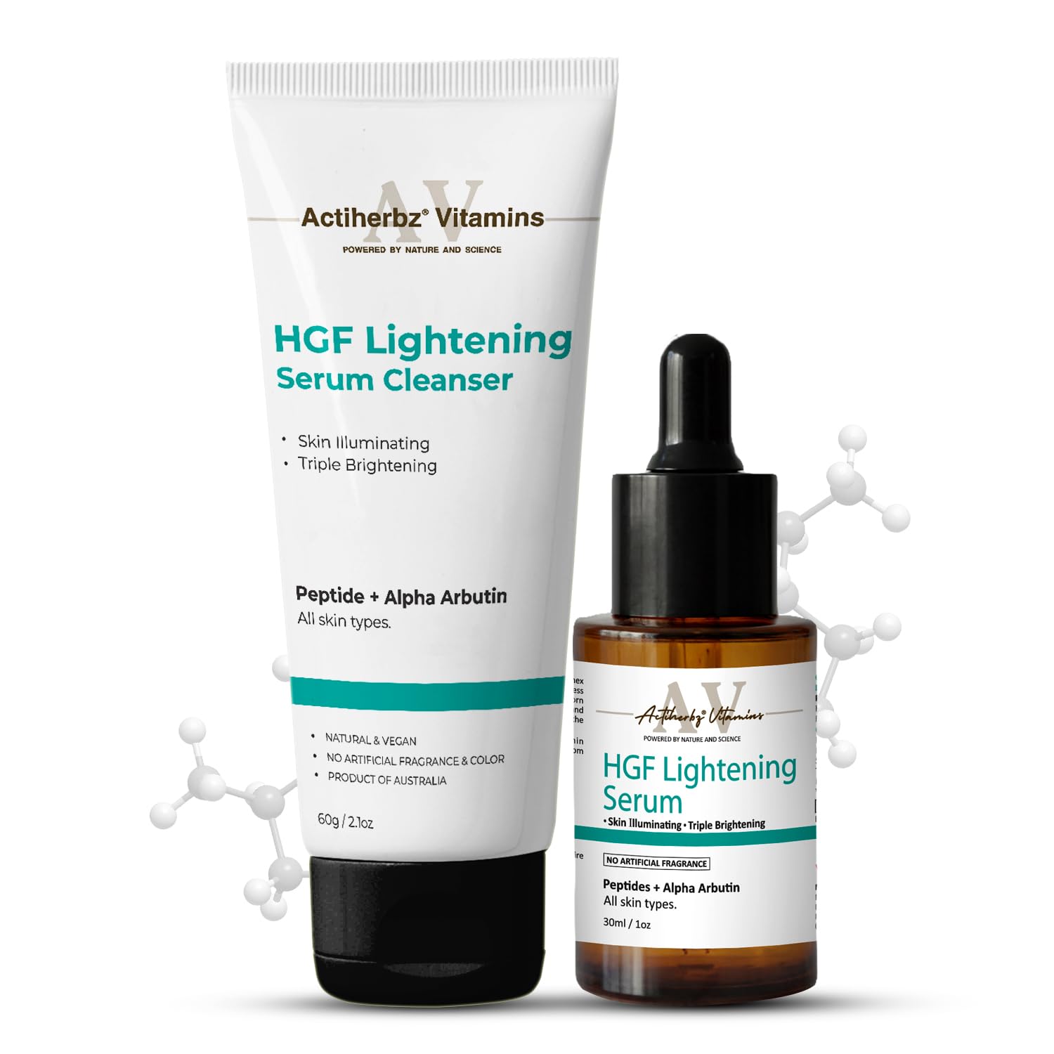 ACTIHERBZ Vitamins HGF Advanced Peptide Combo – your complete radiance solution featuring our HGF Advanced Aqua-Based Peptide Face Serum (30ml) and HGF Lightening Serum Cleanser (60ml). Formulated with Nonapeptide and Alpha Arbutin with Hyaluronic, this transformative duo addresses pigmentation and uneven skin tone from cleansing to treatment. The Triple Glow Boost Formula works to reveal radiant, even-toned skin while deeply hydrating and renewing your complexion. Perfect for all skin types, this vegan and cruelty-free formula is travel-friendly. Simply cleanse with the HGF Lightening Serum Cleanser, follow with 2-3 drops of the HGF Advanced Peptide Serum on damp skin, and unlock luminous, even-toned radiance at every step of your routine.