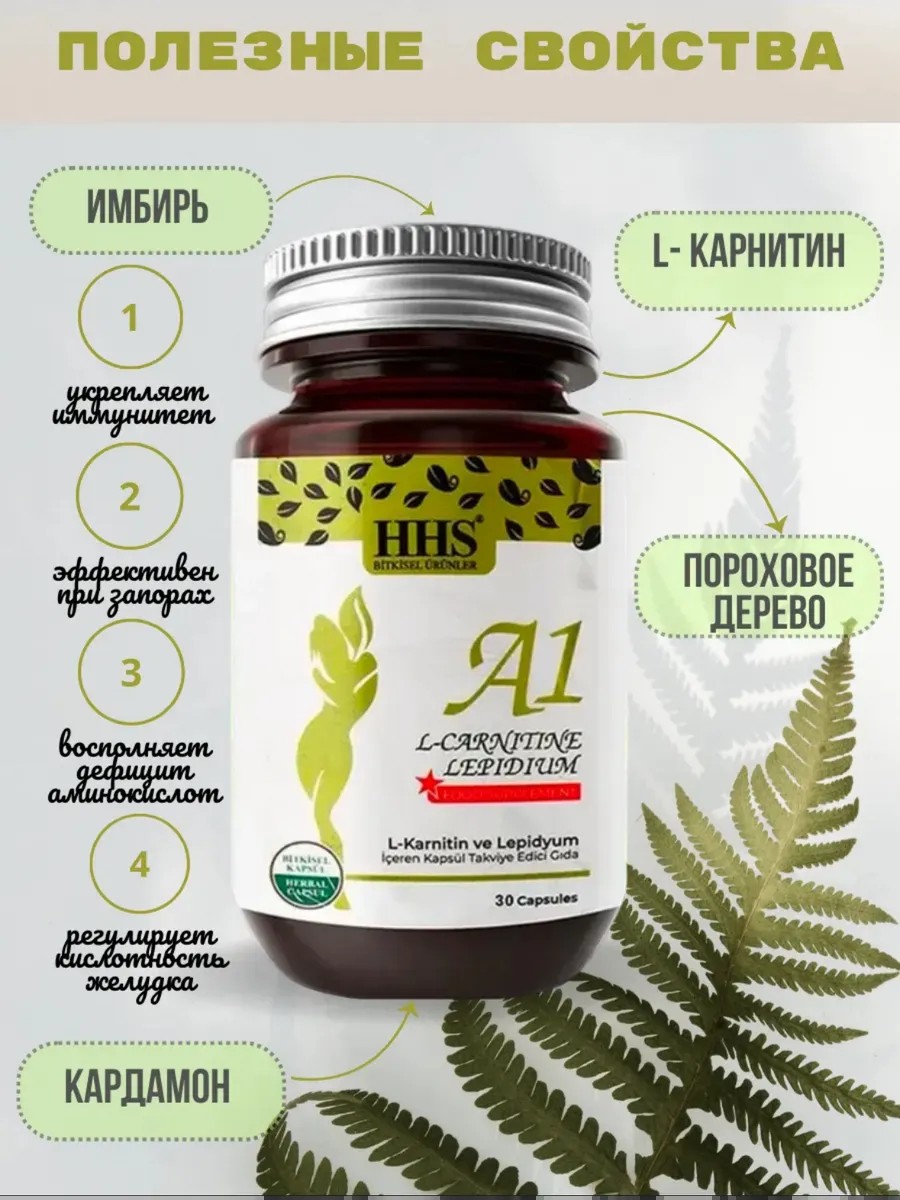 A1 HHS пищевая добавка с L-карнитином и лепидием для похудения 30 капсул Ингредиенты: кора пороха, L-карнитин, кардамон, имбирь, гарциния, лапидий, галангал, фенхель, корица, гвоздика, семена укропа. Полезные свойства: - Пороховое дерево: эффективно помогает при запорах, отвечает за секрецию желчи. Его используют для очистки кишечника от паразитов. Он помогает регулировать пищеварительную систему и систему кровообращения. - L-карнитин: положительно влияет на энергию и спортивную эффективность, поскольку ускоряет сжигание жира. - Кардамон: помогает устранить проблемы с пищеварительной системой. Он регулирует кислотность желудка, облегчает пищеварение и эффективен при выведении желудочно-кишечных газов. - Имбирь: укрепляя иммунитет, он помогает сохранить здоровье при похудении. - Трава галангала: используется для предотвращения образования газов в желудке и кишечнике. - Фенхель: помогает выводить токсины из организма. Расслабляет тело и оказывает профилактическое воздействие на газообразование. Фенхель эффективен для ускорения обмена веществ и очищения кожи. - Корица: ускоряет кровообращение. Это помогает похудеть. Он помогает регулировать уровень сахара в крови: - Гвоздика: очищает организм от микробов и помогает удалить вредные токсины из организма. Гвоздика является хорошим мочегонным средством. - Укроп: облегчает пищеварение. Очищает почки и мочевыводящие пути. Он укрепляет печень. Увеличивает выведение желчи. - Гарциния камбоджийская: помогает контролировать аппетит благодаря содержащимся в ней стероидным гликозидам. Он придает энергию телу и предотвращает такие состояния, как усталость, во время процесса снижения веса. Ускоряет обмен веществ, помогает сжигать жир и предотвращает образование нового жира. Он составляет основу жиросжигающих и насыщающих свойств смеси.