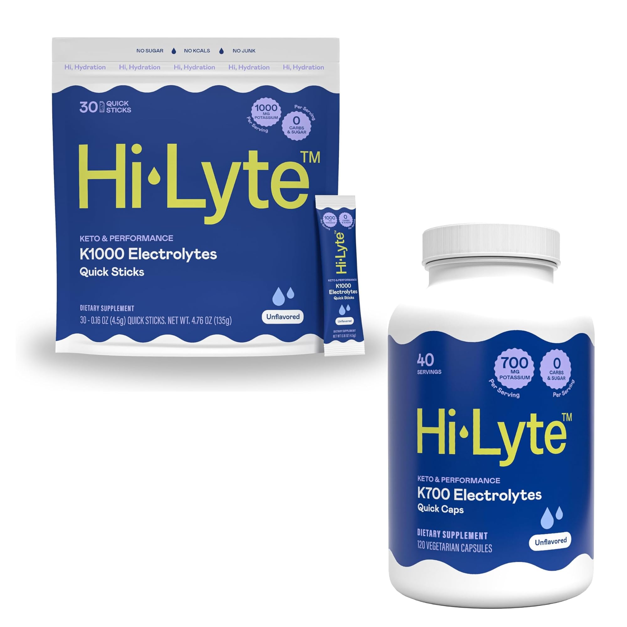 Hi-Lyte Hydration Bundle - Keto K1000 Unflavored Electrolyte Packets (30 Servings) and Keto K700 Elecrolyte Capsules (120 Caps)