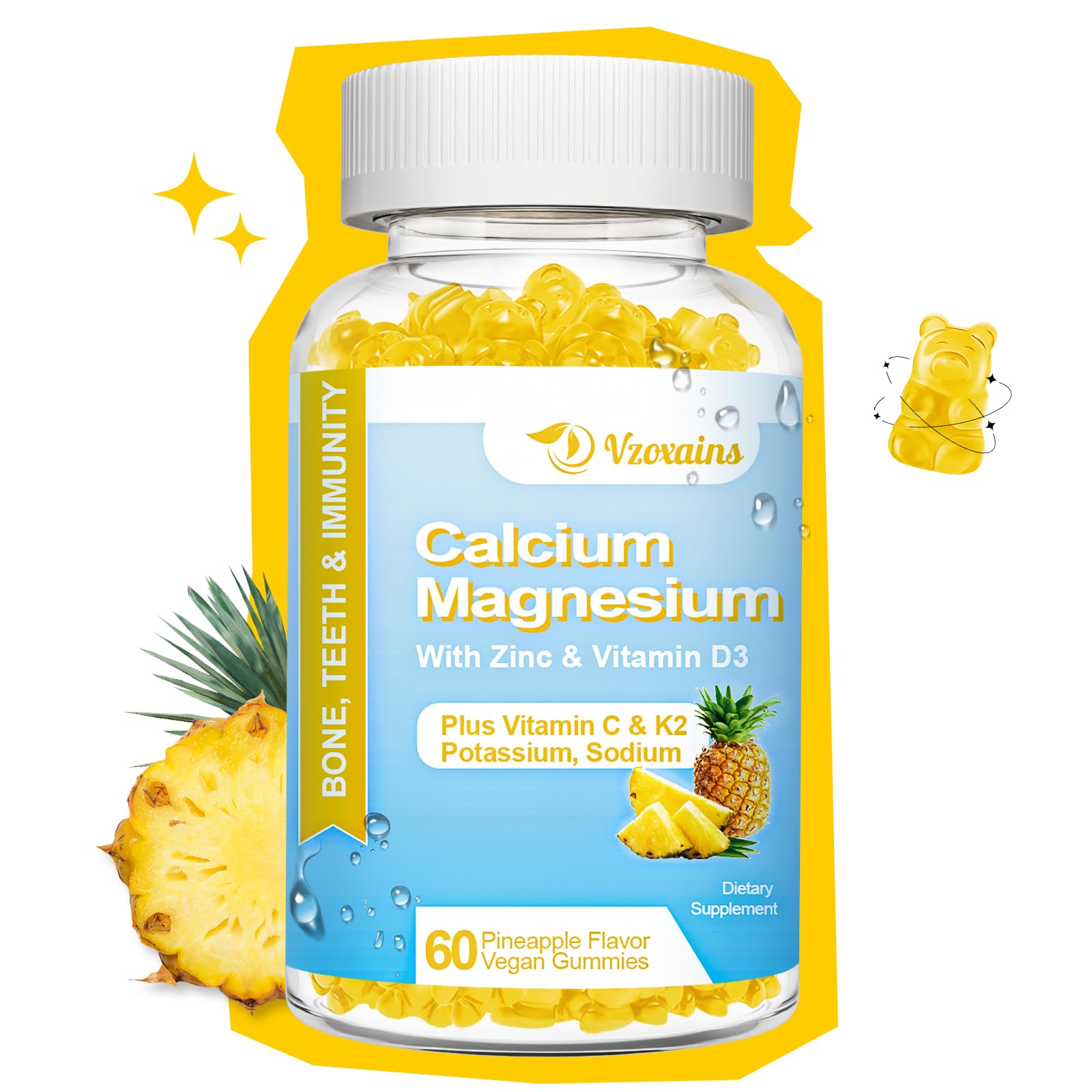 QUALITY GUARANTEED: Vzoxians's calcium magnesium zinc Supplements are produced in the USA in GMP-certified facilities to meet the strict GMP standards. Enjoy the benefits of stronger bones with calcium gummies with vitamin d3. SUGAR FREE, NATURAL PINEAPPLE FLAVOR: These delicious Pineapple flavor calcium chews make staying healthy bone both easy and enjoyable. Our formula is No GMOs, No Preservatives, No Artificial Colors, No Flavors, No Soy and No Gluten, No Gelatin, Vegan. SUPPORT BONE HEALTH AT ANY AGE: As we age, bones can become weak. Our calcium supplement gummies are designed to help maintain bone density and promote healthy bone development. Calcium magnesium gummies perfect for women, men, adults, and kids. ADVANCED FORMULA WITH MULTIPLE BENEFITS: Our scientifically formulated gummies are packed with essential nutrients—calcium, magnesium, zinc, vitamins D3 and K2, vitamin C, potassium, and sodium—to support bone strength, healthy teeth, muscle function, and overall wellness. CALCIUM MAGNESIUM ZINC GUMMIES: Just 2 delicious gummies a day provide 800 mg of Calcium Carbonate, 400 mg of Magnesium Glycinate, and 11 mg of Zinc Citrate. Plus, Vitamin D3 and K2 help ensure proper calcium absorption for stronger bones and healthier teeth.