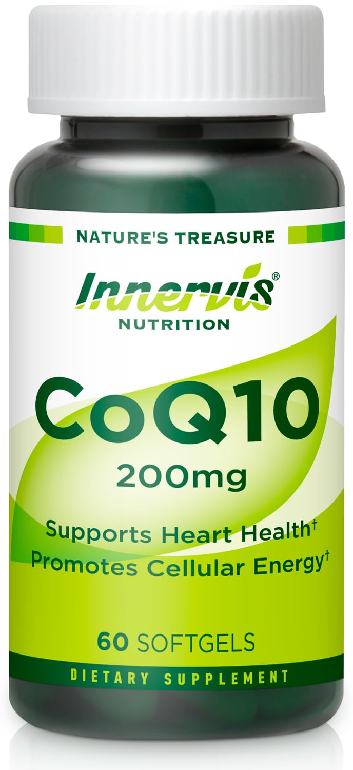 CONVENIENT 30-DAY HIGH-POTENCY SUPPLY: Each bottle contains 60 easy-to-swallow Softgels, providing a full 200mg dose per serving (2 softgels). Non-GMO, Gluten-Free, and quality tested in a GMP certified facility. CRUCIAL SUPPORT FOR STATIN USERS: Statin medications are known to deplete the body's natural CoQ10 levels. Innervis Nutrition helps replenish this vital coenzyme, offering essential support and helping maintain healthy cellular activity. POWERFUL CELLULAR ENERGY METABOLISM: CoQ10 is essential for ATP production, the energy source used by every cell. Our formula promotes robust mitochondrial function, helping to reduce daily fatigue and boosting sustained physical vitality. ADVANCED CARDIOVASCULAR SUPPORT: CoQ10 is concentrated in the heart muscle, fueling its incredible energy demands. Supplementation helps support healthy cardiovascular function, circulation, and maintenance of optimal blood pressure levels already within the normal range. OPTIMAL ABSORPTION SOFTGEL DELIVERY: CoQ10 is fat-soluble. Our premium Softgel format is designed for enhanced bioavailability and faster absorption compared to dry capsule forms, ensuring your body utilizes the full 200mg serving efficiently.