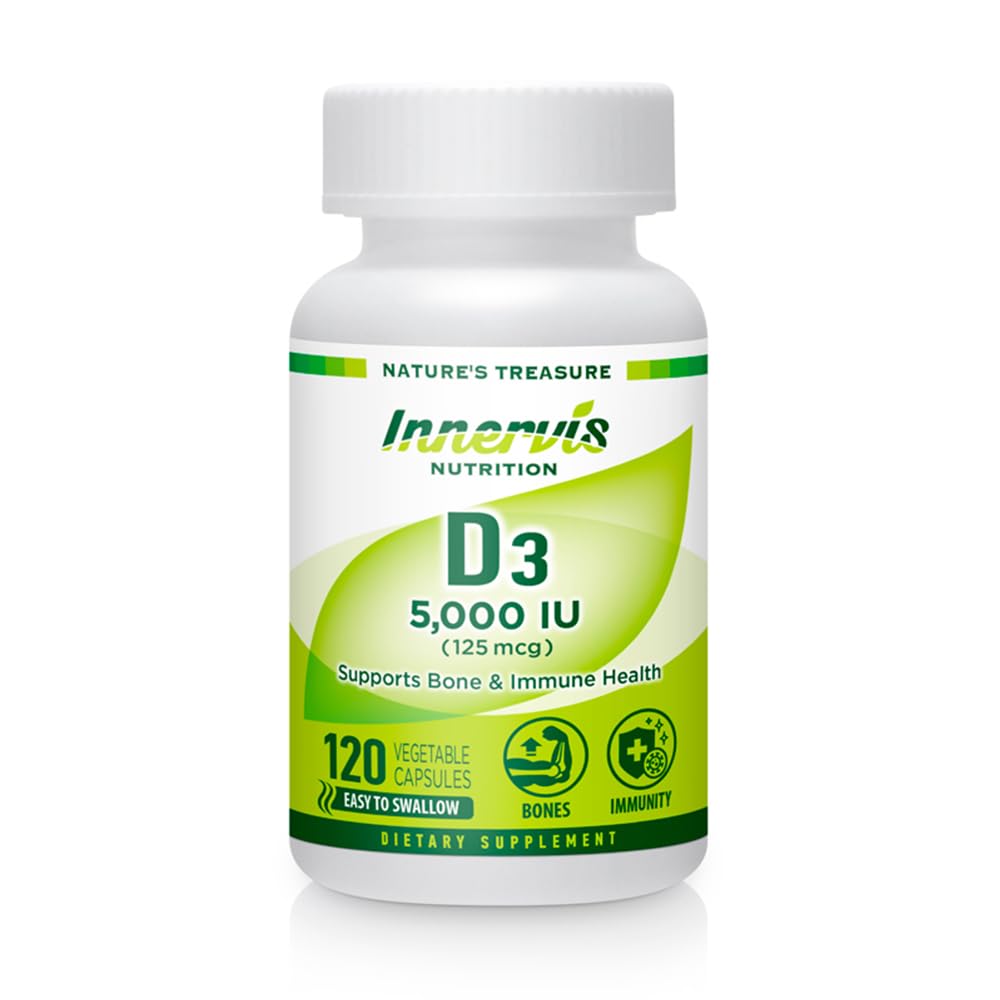 SUGGESTED USE – Adults take one (1) capsule daily, preferably with a meal. Each bottle of D3 5000 IU (125mcg) contains a 4-months supply of 120 vegetable capsules. Store at room temperature. If pregnant, nursing, on medication, or have any medical conditions, consult a healthcare practitioner or physician prior to use. Keep out of reach of children. Do not use if product appears to be tampered with or if seal is broken. Discontinue use and consult your doctor if any adverse reactions occur. HEALTH BENEFITS – Our bodies absorb less and less Vitamin D from the Sun as we age, and eventually will not be able to absorb enough Vitamin D from natural Sunlight to stay healthy. Since Vitamin D is so essential to maintaining good health for bones, muscles, and immune system, you want to ensure you are getting enough Vitamin D from a different source. Oral supplements are the perfect solution as it's easy to take and contains the right amount of Vitamin D you need each day to stay healthy. HIGHEST QUALITY MADE IN USA – All of our products are manufactured in the USA with ingredients sourced from around the world. Manufactured at a cGMP compliant facility with rigorous testing protocols and made with naturally sourced ingredients, you can guarantee real natural purity, potency, and effectiveness with the extensive quality testing done on our products. This supplement provides bone and immune health benefits and is essential for nutrient absorption for a happier, healthier life. SUPPORT BONE IMMUNE HEALTH – Vitamin D has many important beneficial properties, one of them being to support strong bones and teeth. Making sure you intake enough Vitamin D is essential for achieving and maintaining optimal bone mineral density. Vitamin D also supports immune health and promotes healthy muscle function. It is important to intake enough vitamins to not become deficient and this supplement can help with that. Taking D3 will leave you feeling stronger and better than ever. VITAMIN D3 5000 IU SUPPLEMENT – This dietary supplement is formulated with essential Vitamin D. Known as the "Sunshine Vitamin", Vitamin D plays a crucial role in your immune and bone health. It is essential for healthy immune function. Made to support your bone health and boost immunity, this daily health supplement comes in easy to swallow capsules. This uses only top quality ingredients and is non-GMO, gluten-free, and vegetarian friendly.