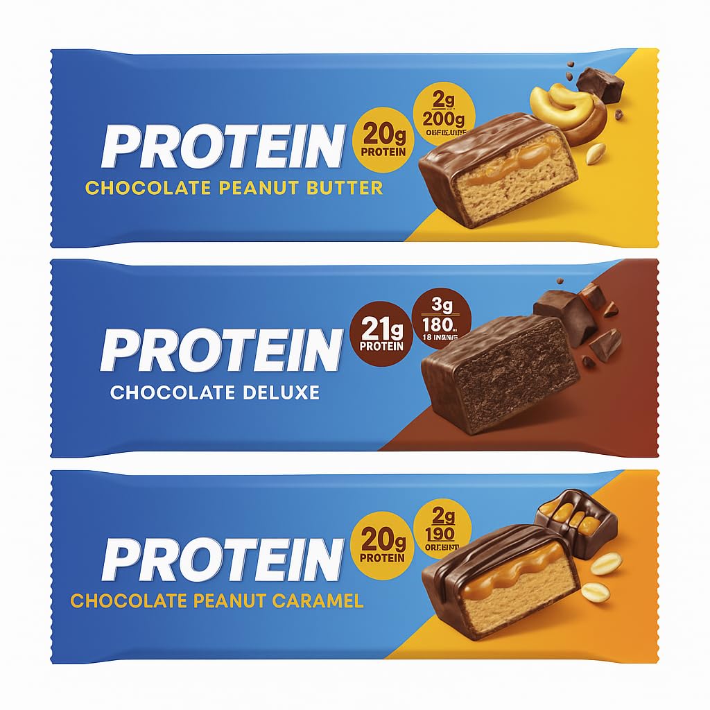 Fuel your body with real energy and great taste! High Protein Variety Pack (11 Count) offers a delicious mix of Chocolate Peanut Butter, Chocolate Deluxe,Chocolate Peanut Caramel bars. Each bar contains 20–21g of proteinand only 2–3g of sugar giving you the perfect blend of nutrition and indulgence. Made for active people who want low sugar, gluten-free, and keto-friendly options, these bars are ideal for gym sessions, workdays, or quick snacks on the go. Enjoy clean energy, satisfying flavor, and balanced nutrition in every bite!