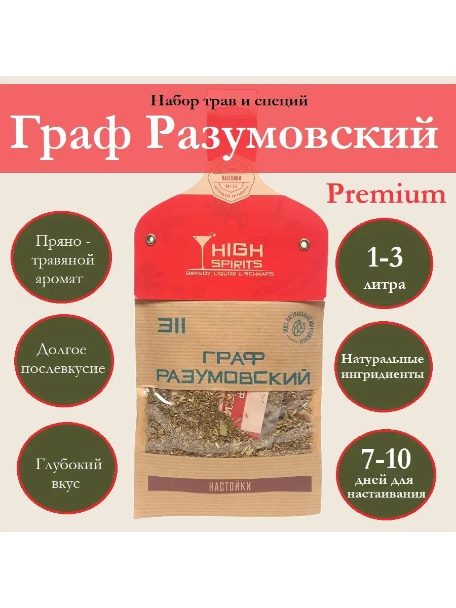 Набор трав и специй "High Spirits" Premium Граф Разумовский, 42 гр— имеет глубокий пряно-травяной аромат и вкус, послевкусие долгое, слега обжигающее от имбиря, хорошо закусывать этот напиток яблоком или цитрусами, отлично подойдет как аперитив. Состав: можжевельник плоды, анис, мята, липовый цвет, имбирь корень. Способ приготовления: 1. Травы и специи залить водкой или спиртом крепостью 42-45%. 1 литр настаивать 7 дней, 3 литра настаивать 14 день в темном месте, периодически встряхивая; 2. Отфильтровать; 3. Дать отдохнуть 3-4 дня. Актуальный рецепт приготовления указан на этикетке.