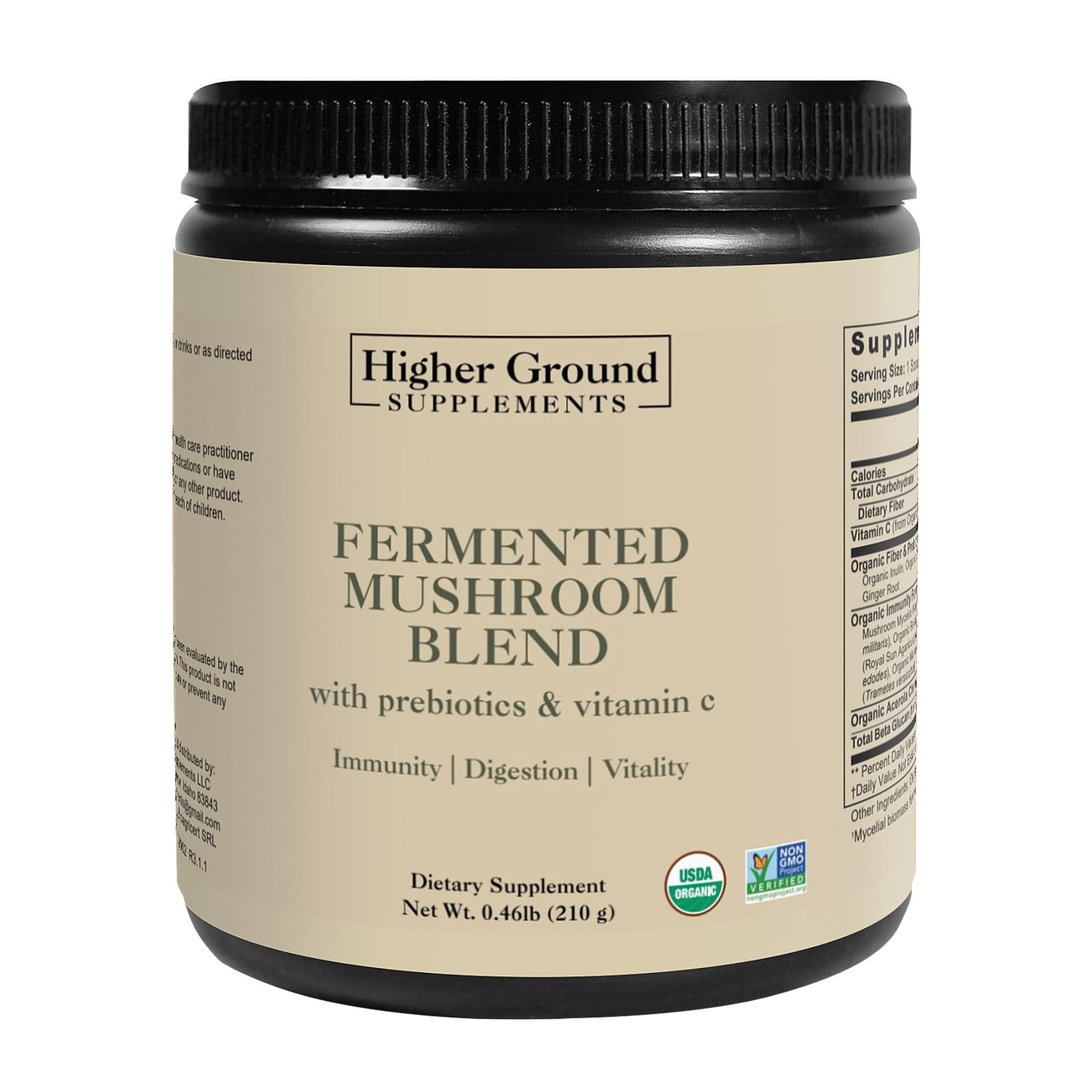 Higher Ground Supplements Fermented Mushroom Blend | from 6 Premium Grown Mushrooms | Prebiotics Fibers and Vitamin C for Immunity | Non-GMO | Gluten-Free | 210g