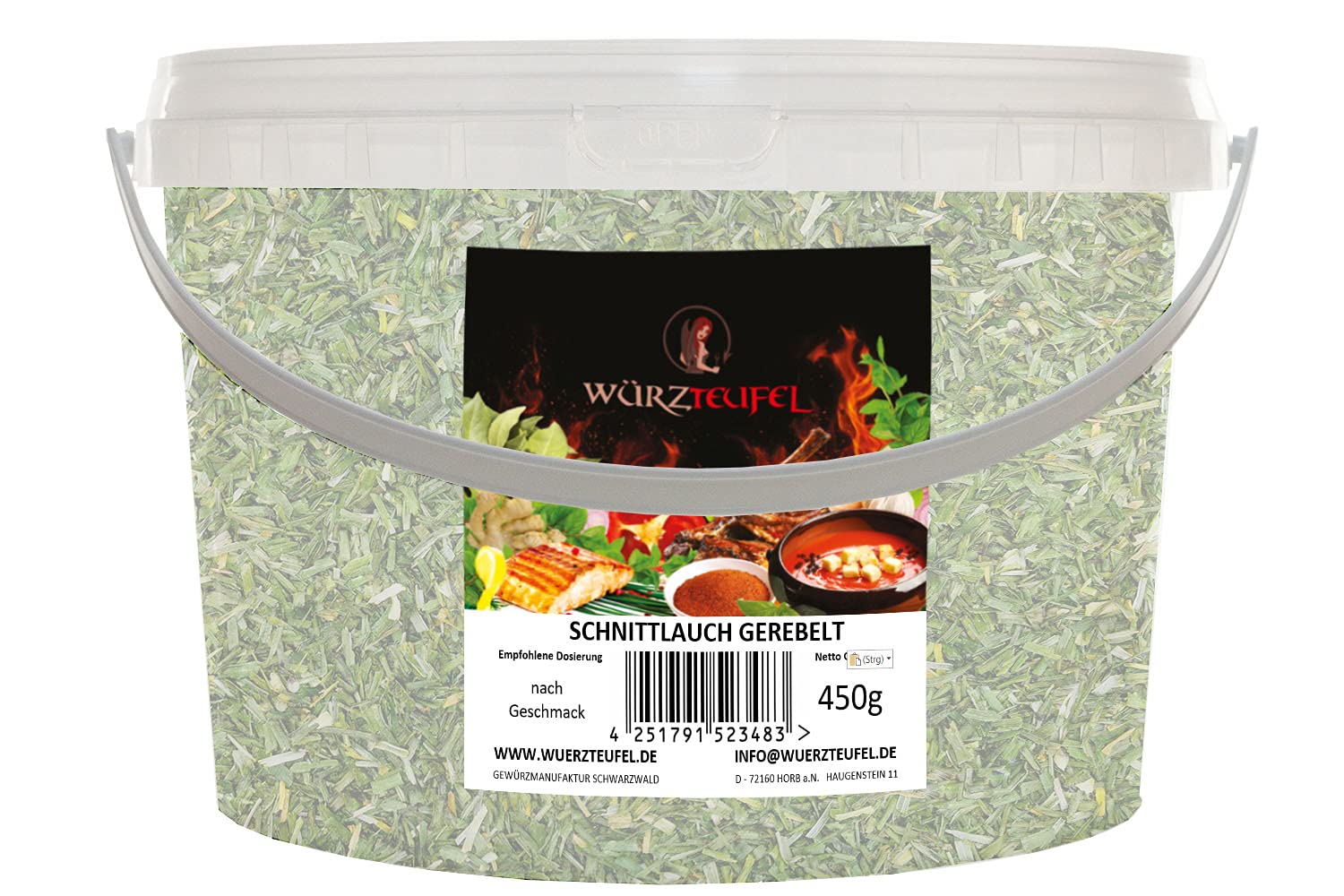 It is one of the most famous herbs in our gardens - chives. The "forest and The prairie plant is cultivated throughout the world today. The juicy green stems of the barrow are part of the "Range of obligatory spices" of Central Europe. The light green tubes impregnated with juice from the cut taste very fresh, slightly sweet, a little burning. Depending on where of chives, it can be harvested all year round. After harvest, the stems are sold, either It is cut into small flakes and dried quickly with hot air. The faster the speed, the less valuable minerals Substances and vitamins are lost. It is rich in iron, vitamins A, B and C, as well as minerals. _______________________________________________________________________________________________________________ We participate with our partners in spice plantations in Asia, South America, India, China and Europe. --------------------------- Only the best is for us. --------------------------- As with many other foods, freshness and quality are essential. Quality is very easy to measure. The higher the ground, the shorter the transport, the smoother it is The grind is more of a premium spice, which is reflected in the essential oil content. We Guarantee for our product with concrete information and synonymous with superior quality, day after day. We are only satisfied when you are hired. For even more offers and more information on the topic of healthy living and enjoyment, Visit our website www.würzteufel.de or write to us at info wuerzteufel.de. DIRECTIONS FOR USE Dosage addition according to your taste.Free delivery within Germany from 50 euros. Packaging: Transparent bucket made of high-quality HD polyethylene with tamper-evident closure and aroma-protecting layer. Filling weight: 450 g. Easy to open and resealable with snap closure. All products in our range are food products. The original sealed containers have a best-before date of one year from the date of order. To ensure that the product quality remains intact long after the original seal has been opened, the storage conditions must be observed. - Store the items in the dark. - The humidity must not exceed 75 . - Do not exceed the storage temperature of 25 C. We, the Schwarzford spice manufactory, manufacture over 90 of our products independently in good craftsmanship. As a retailer, we offer you unbeatable prices, as well as a wide variety of products and packaging variants for end consumers and businesses. We present our absolute bestsellers on and wish you a lot of fun with your shopping. Salads such as sausage and meat salads, potato salads, and egg salads benefit from the spicy taste of chives. Even most soups, herb butter, or hot white wine can no longer be imagined without their delicate flavor and attractive appearance. Fine chives from German production, rolled to about 2 mm. From controlled and sustainable cultivation. Pure natural, without chemical additives, GMO-free. Germs are reduced thanks to gentle steam sterilization. Il fait partie des herbes les plus connues de nos jardins - la ciboulette. La « forêt et La plante des prairies est cultivée aujourd'hui dans le monde entier. Les tiges vertes juteuses de la brouette font partie de la « Gamme d'épices obligatoires » de l'Europe centrale. Les tubes vert clair imprégnés de jus de la coupe ont un goût très frais, légèrement sucré, un peu brûlant. Selon l'endroit où de ciboulette, il peut être récolté toute l'année. Après la récolte, les tiges sont vendues, soit Il est coupé en petits flocons et séché rapidement avec de l'air chaud. Plus la vitesse est rapide, moins les minéraux précieux Les substances et les vitamines sont perdues. Elle est riche en fer, vitamines A, B et C, ainsi que en minéraux. _______________________________________________________________________________________________________________ Nous participons avec nos partenaires aux plantations d'épices en Asie, en Amérique du Sud, en Inde, en Chine et en Europe. --------------------------- Seul le meilleur est pour nous. --------------------------- Comme avec de nombreux autres aliments, la fraîcheur et la qualité sont essentielles. La qualité est très facile à mesurer. Plus le sol est élevé, plus le transport est court, plus il est doux La mouture est plus une épices de qualité supérieure, ce qui se reflète dans la teneur en huiles essentielles. Nous Garantie pour notre produit avec des informations concrètes et synonyme de qualité supérieure, jour après jour. Nous sommes seulement satisfaits lorsque vous êtes engagé. Pour encore plus d'offres et plus d'informations sur le thème de la vie et du plaisir sain, Visitez notre site www.würzteufel.de ou écrivez-nous sur info wuerzteufel.de. MODE D'EMPLOI Dosage addition selon vos goûts.Livraison gratuite en Allemagne à partir de 50 euros. Emballage : seau transparent en polyéthylène HD de haute qualité avec fermeture inviolable et couche protectrice des arômes. Poids du rembourrage : 450 g. Facile à ouvrir et refermable avec fermeture à pression. Tous les produits de notre gamme sont des produits alimentaires. Les contenants scellés d'origine ont une date de péremption d'un an à compter de leur commande. Afin que la qualité du produit reste longtemps après l'ouverture du joint d'origine, les conditions de stockage doivent être respectées. - Rangez les articles dans l'obscurité. - L'humidité de l'air ne doit pas dépasser 75 . - Ne pas dépasser la température de stockage de 25 C. Nous, la manufacture d'épices Schwarzford, fabriquons plus de 90 de nos produits de manière autonome dans une bonne tradition artisanale. En tant que détaillant en détail, nous vous proposons des prix imbattables, ainsi qu'une grande variété de produits et des variantes d'emballage pour les consommateurs finaux et les entreprises. Nous vous présentons nos best-seller absolus sur et vous souhaitons beaucoup de plaisir avec vos achats. Les salades comme les sal