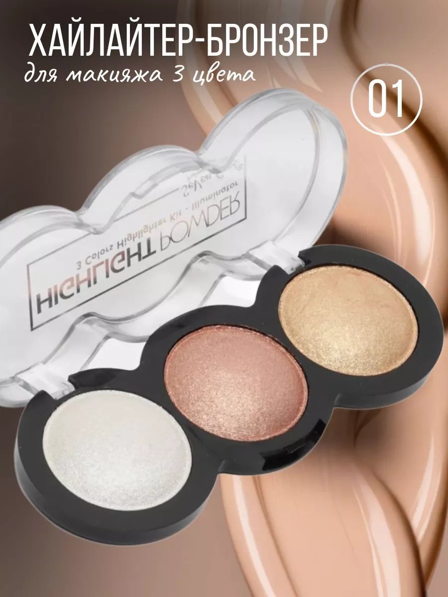 Компактная палетка 3 в 1 сверкающих хайлайтеров для лица. Покрытие от легкого до плотного. Визуально корректирует черты лица - подсвечивает, позволяет подчеркнуть скулы. Идеальное сочетание в одной палетке сразу 3 оттенков. Хайлайтер для лица потрясающе удобен в использовании. Профессиональная текстура позволяет идеально растушевать продукт без всяких усилий. Визуально моделирует лицо. Не требует много времени на создание макияжа. Скульптор придаст рельефу лица выразительность, четкость, блеск. Может быть использован как шиммер для тела, для глаз и как блестки для век. Инструменты для хайлайтинга и контуринга позволят приблизить черты лица к желаемым, расставить акценты, сделать кожу более свежей, ровной и сияющей. Подойдет как профессиональному визажисту, так и начинающему. Блестки в течение дня не осыпаются. Тени палетки придают особое сияние. Можно использовать для всех типов кожи.
