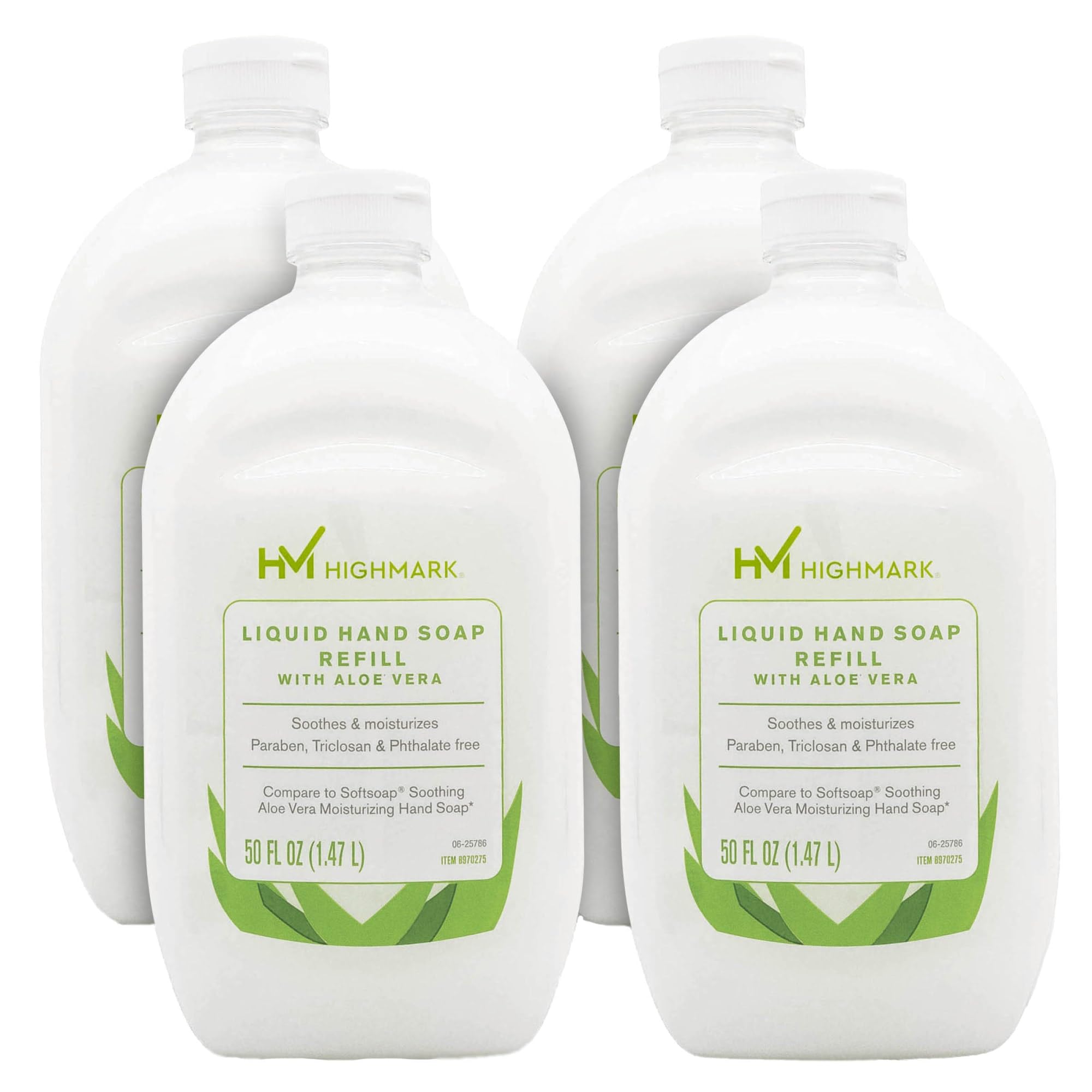 Case of 4 bottles (50 oz each) to refill your Highmark Aloe Liquid Hand Soap. Features a floral scent. Thick and creamy formula for a soft, smooth feel. Moisturizes with aloe vera to nourish dry skin. Highmark aloe liquid hand soap has a thick and creamy formula to deeply clean your hands for a soft, smooth feel. Helping to both combat germs and moisturize, this aloe vera liquid soap will leave your hands feeling great all day long.