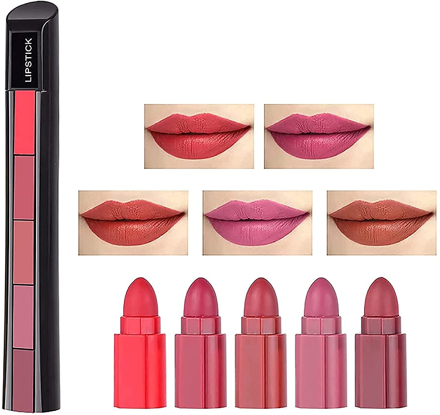 Features: Type: 5-in-1 Velvet Matte Lipstick Colors: 5-color set Suitable for: General use Dimensions: 14.5 x 2 x 1.8 cm Weight: 33 g Shelf life: 3 years How to use: Remove the top cap and push the lipstick upwards. Contents: 1 lipstick Tips: Stretch lips during application to avoid creg. Wipe with makeup remover when removing makeup. The color of the lipstick inside will be slightly different from the color outside. Keep out of reach of children.Easy to remove: Cruelty-free, vegan, and not tested on animals. Long-lasting and kiss-proof, easily removed with oil-based makeup remover. Multiple occasions : Silky, exquisite, and elegant, it lightly coats your lips, suitable for all seasons, especially for the office, dates, shopping, and summer evenings with friends. Natural formula : Made with beeswax, mineral oil, and other natural ingredients, the natural beeswax locks in moisture for a long-lasting hydrating effect, giving you a beautiful, attractive matte color instantly. Easy to carry : Trendy lipstick with a new 5-in-1 design. A variety of colors are available. Convenient to carry, with a range of colors, suitable for everyday travel. Long-lasting color: The velvet matte lipstick is highly pigmented to provide rich color and a comfortable, lightweight feel. With full coverage that will last all day.Rouge à lèvres mat 5 en 1 classique non marquant, imperméable, longue durée, lisse, doux à portée, couleurs complètes, anti-adhésif, brillant, hydratant pour femme (A)DESCRIPTION DU PRODUIT Caractéristiques : Type : rouge à lèvres mat velours 5 en 1 couleurs Couleurs : lot de 5 couleurs Convient pour : général. Dimensions : 14,5 x 2 x 1,8 cm Poids : 33 g Durée de conservation : 3 ans Utilisation : retirez le couvercle supérieur et poussez le rouge à lèvres vers le haut. Contenu : 1 rouge à lèvres. Conseils : Étirez les lèvres pendant l'application pour éviter les rides. Essuyez avec un démaquillant lorsque vous retirez le maquillage. La couleur du rouge à lèvres intérieur sera légèrement différente de celle de l'extérieur. Tenir hors de portée des enfants.Facile à enlever : sans cruauté envers les animaux, végétalien et non testé sur les animaux. Longue tenue et résistant aux baisers, facile à enlever avec de l'huile dissolvante. Plusieurs occasions : il est soyeux, exquis et élégant, maquille vos lèvres légèrement, adapté pour toutes les saisons, en particulier au bureau, en rendez-vous, en shopping, en soirée d'été avec des amis. Formule naturelle : cire d'abeille, huile minérale et autres ingrédients naturels, la cire d'abeille naturelle bloque l'eau pour obtenir un effet hydratant durable, vous obtenez une belle couleur mate attrayante au moment. Facile à transporter : rouge à lèvres tendance avec un nouveau design 5 en 1. Une variété de couleurs sont disponibles. Pratique à transporter, avec une variété de couleurs, adapté pour les voyages quotidiens. Couleur longue durée : le rouge à lèvres mat velours est hautement pigmenté pour donner une couleur riche et une sensation de légèreté confortable. Avec une couverture complète qui durera tout au long de la journée.