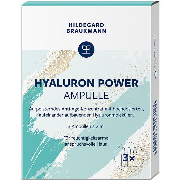 Hildegard Braukmann Hyaluron Power Ampoule for dehydrated and demanding skin. Maximum hydration, intense anti-aging, and lasting regeneration thanks to the combination of high and low molecular weight hyaluronic acid with innovative 24-hour hydration technology. Fine lines are plumped from the inside out and visibly smoothed. Instructions for use: How to open the glass bottle: Shake well before use. Allow the liquid to flow from the tip of the ampoule by gently tapping downwards. Place the ampoule opener on the tip of the ampoule and break the end of the ampoule at the white ring marking. Important: Only break the ampoule using the ampoule opener provided. Avoid direct contact of the broken end of the ampoule with the skin. For external use only. Keep out of reach of children. Place the contents of the ampoule in the palm of your hand and spread over your cleansed face, neck, and décolleté (for example, by gently patting or massaging), then apply a nourishing cream. One ampoule is sufficient for one application. The ampoules are for immediate use after opening. Recommended frequency of use: for example, as a 3-day treatment. 3 x 2 ml ampoules SAFETY WARNING - None