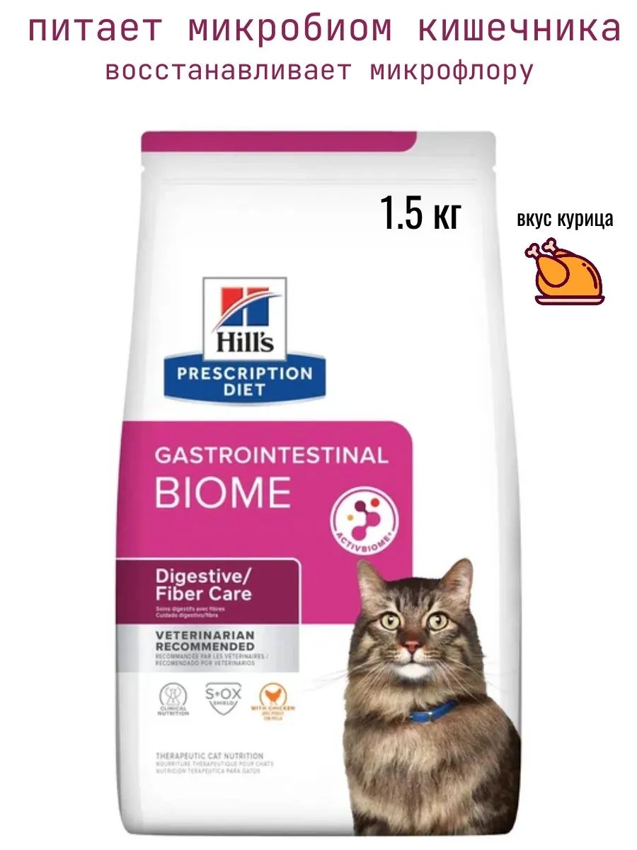 Множество факторов может негативно влиять на пищеварение Вашей кошки. Когда возникают такие проблемы, сложности испытывает вся семья. Хорошая новость в том, что Вы можете помочь кошке чувствовать себя лучше с кормом, который коренным образом меняет подход к заболеваниям желудочно-кишечного тракта, поддающимся коррекции с помощью клетчатки, и обеспечивает баланс микробиома ЖКТ - уникальной экосистемы пищеварительного тракта вашего питомца, которая стоит на страже здорового пищеварения. br/br/Диетологи и ветеринарные специалисты Hill`s разработали рацион Hill's Prescription Diet Gastrointestinal Biome с передовой технологией ингредиентов ActivBiome+, которая, клинически доказано, восстанавливает регулярный нормальный стул всего за 24 часа и снижает риск рецидива. Передовая технология ингредиентов ActivBiome+ питает микробиом питомца. Уникальная смесь пребиотических волокон стимулирует микробиом питомца для выработки полезных постбиотиков.br/br/Hill's Prescription Diet Gastrointestinal Biome способствует регулярному здоровому стулу всего за 24 часа и помогает снизить риск рецидива расстройств пищеварения. br/br/Быстро питает кишечный микробиом и способствует здоровому стулу. br/br/Способствует росту полезных кишечных бактерий для поддержания здоровья пищеварительной системы. br/br/Помогает снизить риск рецидива расстройств пищеварения. br/br/ActivBiome+ - смесь пребиотиков (9,6%): Измельченная оболочка пекана, сухая мякоть сахарной свеклы, семя льна, сухие выжимки цитрусовых, сухая клюква. br/br/Легкопереваримые ингредиенты: Мука из курицы и индейки, мука из кукурузного глютена, животный жир, рисовая сечка, кукуруза. br/br/Питательные вещества: Витамин А 11127 МЕ, Витамин D3 915 МЕ, Витамин E 675 мг, Витамин С 110 мг, Бета-каротин 1,5 мг. br/br/Добавки: Железо 66,7мг, Йод 1,0мг, Медь 6,6мг, Марганец 6,9мг, Цинк 138мг, Селен 0,2мг, с натуральным антиоксидантом. br/br/Калорийность: Ккал/100г: 379.