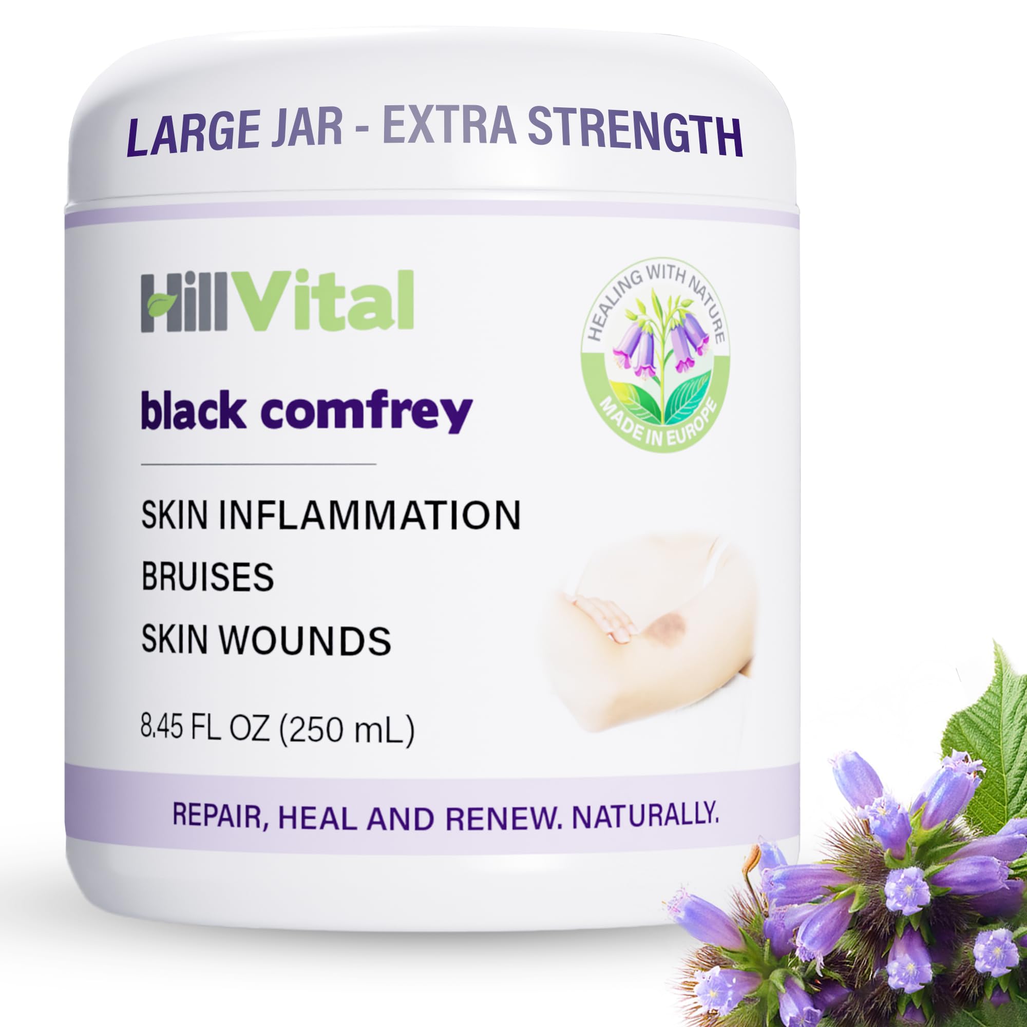 The HillVital Mission: We strive to bring you the cleanest products! Formulas backed by thousands of years of herbal wisdom. Solutions that have stood the test of time, combined with and improved by modern technology. Products to boost the quality of your days, putting years into your life and life into your years. From some of the best scar and bruise cream through balms helping rheumatic joint complaints, psoriasis, eczema, muscle pain, varicose veins, to wounds, cold, flu and much more. Multiple uses: Bruises, hematomas (pool of mostly clotted blood that forms in an organ, tissue, or body space) usually caused by damaged blood vessels, reduction of purple spots, ulcerated skin conditions, varicose inflammations, swelling, bone fractures (applied externally through gentle massage). Assist tennis elbow, bruise remove, advanced scar gel, tenderness in joints, sprained wrists, broken toes and more! Speeding up the natural healing processes of the body with a powerful herbal balm. Moisturizes, Mild Herbal Scent: black comfrey has been used for centuries in skin healing creams to remove bruises. Actually works! Furthermore it moisturizes, softens and rejuvenates all skin types, which is why it became a main ingredient in wound gels. Furthermore, in complete tissue and bone healing comfrey ointment has almost no rival and can challenge any other advanced scar gel on the market too. Give raptured or dry skin, torn ligaments, stressed bones what they need to heal faster. Versatile, High Quality Natural Bruise Remedy: medicinal herb that works wonderfully! 100 vegan, paraben free, botanical herbal ingredients without added fillers, toxins or chemicals. Use when thinking about how to get rid of thin skin bruises through promoting healing of cuts, scrapes, burns (after first aid), all the way to reducing pain and discomfort from physical injuries like bumps, bruises, falls, rips, and tears. For inflammation or soreness due to arthritis, muscle strains, injuries. Restore, rejuvenate and repair your skin: accelerate wound healing with a natural comfrey cream for pain herbal salve. A great alternative to arnica bruise gel, manuka honey wound care, arnica cream for bruises and medical (medi) honey wound gel. Works great! Massage a pea sized amount into the clean, painful area 3 times a day. Not for open wounds. Thanks to its Allantoin content it calms the irritated area while enhancing cell regeneration in order to repair the damaged tissue. Live life happy.