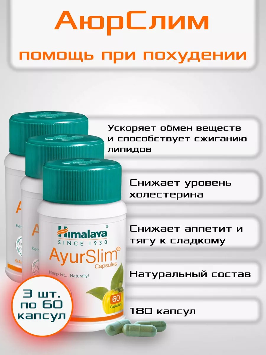 Himalaya AyurSlim (Аюрслим) — Индийский аюрведических препарат, который помогает людям справляться с одними из наиболее распространенных в наше время недугами — лишним весом и отложением холестерина в сосудах. Тщательно подобранное сочетание трав в единой формуле Ayurslim Himalaya, позволяет организму безопасно сжигать жир в теле, обеспечивая длительный эффект в отличие от большинства других предлагаемых средств для похудения. Главное его достоинство в том, что он значительно уменьшает тягу к сладкому и перееданию в целом, в особенности на нервной почве. Способствует не только контролю веса, но и улучшению работы органов пищеварительного тракта. Действие препарата обусловлено эффектом снижения аппетита за счет свойств таких растительных компонентов, как харитаки, мешашринги, врикшамла, пажитник и смола дерева гуггул. Запускает механизм мягкого очищения организма от токсинов, что приводит к нормализации функции пищеварения, а также улучшению состояния кожи и суставов. Очищает кровь, снижает уровень глюкозы и холестерина, нормализует уровень триглицеридов.