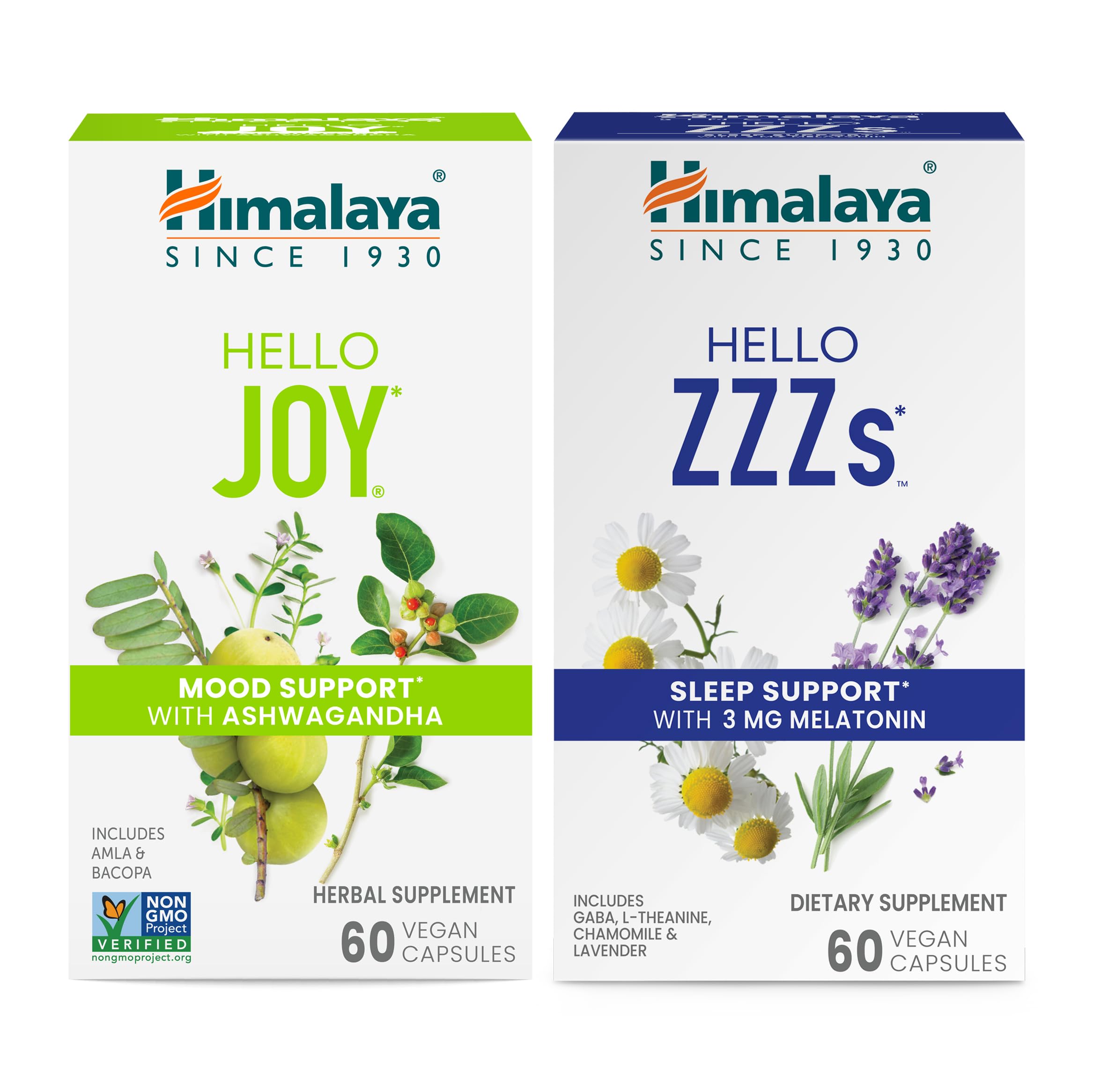QUALITY SAFETY: Produced in a cGMP Good Manufacturing Practices certified facility with ingredients that are rigorously tested for identity and strength, and clinically studied for safety and effectiveness through recognized clinical protocols and highly sophisticated instruments. FOR OCCASIONAL SLEEPLESSNESS: Himalaya Hello ZZZs supports your comfort and serenity for maximum efficacy in just one capsule, taken 30 minutes before bedtime. HIMALAYA HELLO ZZZs: 3 mg of Melatonin provide gentle and relaxing sleep support in a formula that also includes GABA, L-Theanine, Chamomile and Lavender. FOR BRIGHTER DAYS: Helps lift you up with wellness herbs that support good, happy feelings. HIMALAYA HELLO JOY: Helps support emotional wellness and a positive mood and promotes normal cortisol levels to keep you calm.