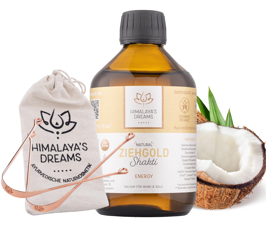 Our mouthpieces consist of bio-sesame oil, organic sunflower oil and organic coconut oil in their main components.Oil pulling has been used widely in Ayurveda since ancient times because of its so many health advantages.Cinnamon oil is an effective cleaning agent for oral health care.It even helps with a sore throat.Cinnamon oil contains antimicrobial properties that protect against bacteria that are responsible for caries.Black pepper oil contains calcium, potassium and selenium that offers the right nutrition for teeth and gums.This oil helps to maintain oral hygiene and keeps your teeth and gums strong. Ingredients ingredients Sesame oil, sunflower oil, coconut oil, cardamom oil, black pepper oil, campaign oil, cinnamon oil- Our Ayurvedic cosmetics is produced according to original Ayurveda.The traditional and elaborate production helps to counteract gum infections and gum return and achieve a perfect result.- Good vibes only!We stand for transparency, fair trade, animal test -free, vegan, without additives, without silicone, without parabens, without mineral oils . Our products have been checked to the smallest for the Cosmos Standard certificate.- already feel, see and feel the wonderful effect of the purely natural ingredients after the first applications.The mouthwash is antibacterial and leaves a healthy and soothing oral flora.The tooth whitening helps and thus makes teeth white.- The Himalaya s Dreams mouthwash with herbal essences consists of many very high -quality ingredients.Cardamom oil, cinnamon oil, fabric oil and black pepper oil including tongue cleaners and copper cups help to combat bad breath.- Himalaya s Dream's mouthpiece, mouthwash without fluoride is a very pleasant oil for oil pulling.The organic coconut oil, organic sunflower oil and organic sesame oil are perfect to remove tooth discoloration, as bleaching for teeth and antiviral mouthwash, detoxification and compensation of the acidity bases.Unsere Mundziehöle bestehen in Ihren Hauptbestandteilen aus Bio-Sesamöl, Bio-Sonnenblumenöl und Bio-Kokosöl. Ölziehen wurde wegen seiner so vielen gesundheitlichen Vorteilen weithin in Ayurveda seit der Antike verwendet. Zimtöl ist ein wirksames Reinigungsmittel für die Mundgesundheitspflege. Es hilft sogar bei Halsschmerzen. Zimtöl enthält antimikrobielle Eigenschaften, die vor Bakterien schützen, die für Karies verantwortlich sind. Schwarzer Pfeffer Öl enthält Kalzium, Kalium und Selen, die richtige Ernährung für Zähne und Zahnfleisch bietet. Dieses Öl hilft bei der Aufrechterhaltung der mündlichen Hygiene sowie hält die Zähne und Zahnfleisch stark. INHALTSSTOFFE ZUTATEN Sesamöl, Sonnenblumenöl, Kokosnussöl, Kardamomöl, Schwarzer Pfefferöl, Kampferöl, Zimtöl- Unsere ayurvedische Kosmetik wird nach original Ayurveda Rezepturen hergestellt. Die traditionelle und aufwendige Herstellung hilft Zahnfleischentzündungen und Zahnfleischrückgang entgegenzuwirken und ein perfektes Ergebnis zu erzielen. - Good Vibes Only! Wir stehen für Transparenz, Fair Trade, Tierversuchsfrei, Vegan, ohne Zusätze, ohne Silikon, ohne Parabene, ohne Mineralöle… Unsere Produkte wurden bis ins kleinste für das COSMOS STANDARD Zertifikat überprüft. - Bereits nach den ersten Anwendungen spüren, sehen und fühlen Sie die wunderbare Wirkung der rein natürlichen Inhaltsstoffe. Das Mundspülung ist antibakteriell und hinterlässt eine gesunde und wohltuende Mundflora. Hilft der Zahnaufhellung und macht so Zähne weißer. - Die Himalaya s Dreams Mundspülung mit Kräuteressenzen besteht aus vielen sehr hochwertigen Inhaltsstoffen. Kardamom Öl, Zimt Öl, Kampfer Öl und Schwarzer Pfeffer Öl inkl Zungenreiniger und Kupferbecher helfen Mundgeruch zu bekämpfen. - Himalaya s Dreams Mundziehöl, Mundwasser ohne Fluorid ist ein sehr angenehmes Öl zum Ölziehen. Das Bio Kokosnussöl, Bio Sonnenblumenöl und Bio Sesamöl sind perfekt um Zahnverfärbungen zu entfernen, als Bleaching für Zähne und antivirale Mundspülung, Entschlackung und Ausgleich des Säure Basen Haushalt geeignet.Himalaya s Dreams Mundziehöl, Zahnöl ENERGY 2[zertifizierte BIO Naturkosmetik ]250ml - Ayurveda Ritual für Zahnpflege Zahnbleaching