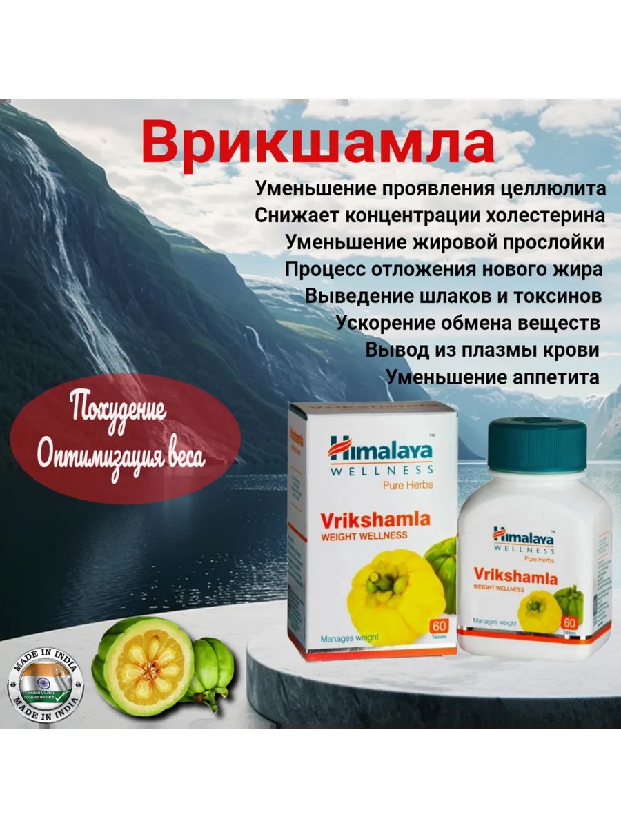 Врикшамла Хималая – аюрведический растительный препарат в таблетках для снижения чрезмерного веса. Препарат поможет похудеть и при этом сохранить здоровье, поддерживать себя в форме. Врикшамла снижает вес за счет улучшения обмена веществ, сжигания/распада жиров. Таблетки снижают аппетит, ускоряют обмен веществ, расщепляют и выводят жиры. Врикшамла устраняет желание лакомиться, когда человек сыт, и «заедать» проблемы при стрессах. Гидроксилимонная кислота в составе Врикшамлы сигнализирует мозгу о насыщении во время еды, не давая переедать, снижает тягу к сладкому и мучному, тормозит образование жиров из глюкозы, усиливает их распад. Препарат также активизирует выработку серотонина – гормона радости. Он очищает печень, предотвращает жировой гепатоз. При правильном применении препарата с учетом советов диетолога за месяц возможно сбросить 4-8 кг. Препарат также способствует нормализации давления, работе пищеварительной системы, как часть комплексной терапии используется при лечении ревматизма, нарушений менструального цикла и гормонального фона у женщин. Таблетки Врикшамла не содержат примесей и консервантов, не вызывают побочных эффектов. Состав: экстракт Гарцинии камбоджийской (Garcinia cambogia). Показания к применению: ожирение, излишний вес, повышенный аппетит; нарушения метаболизма, липидного и белкового обмена с отложением холестерина; паразиты (в комплексе); нарушения менструального цикла у женщин. Способ употребления: по 1 таблетке 2 раза в день с теплой водой (1 стакан) через 30-40 минут после еды. Во время лечения выпивать достаточное количество воды. Во избежание привыкания рекомендуется чередовать прием препаратов для похудения: Аюрслим, Трикату, Сунтхи, каждого по одной упаковке. Препарат не гарантирует мгновенного эффекта снижения веса. Результат зависит от начальных показателей здоровья пациента, его особенностей, образа жизни и питания. Противопоказания: индивидуальная непереносимость ингредиентов; детский возраст до 14 лет; беременность, лактация; тяжелые хронические заболевания печени, почек, гормональной системы, обмена веществ – только после консультации специалиста. Соблюдение низкоуглеводной или безуглеводной диеты, прием сахароснижающих препаратов или инсулина; сахарный диабет, болезнь Альцгеймера/деменция. Не является лекарственным средством.