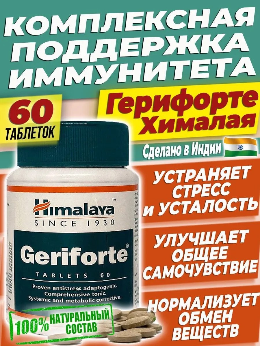 | Форма выпуска | индийские таблетки Geriforte Хималая; травяной сбор для иммунитета Джерифорте Гималая; натуральный растительный состав - вегетарианский продукт из Индии |