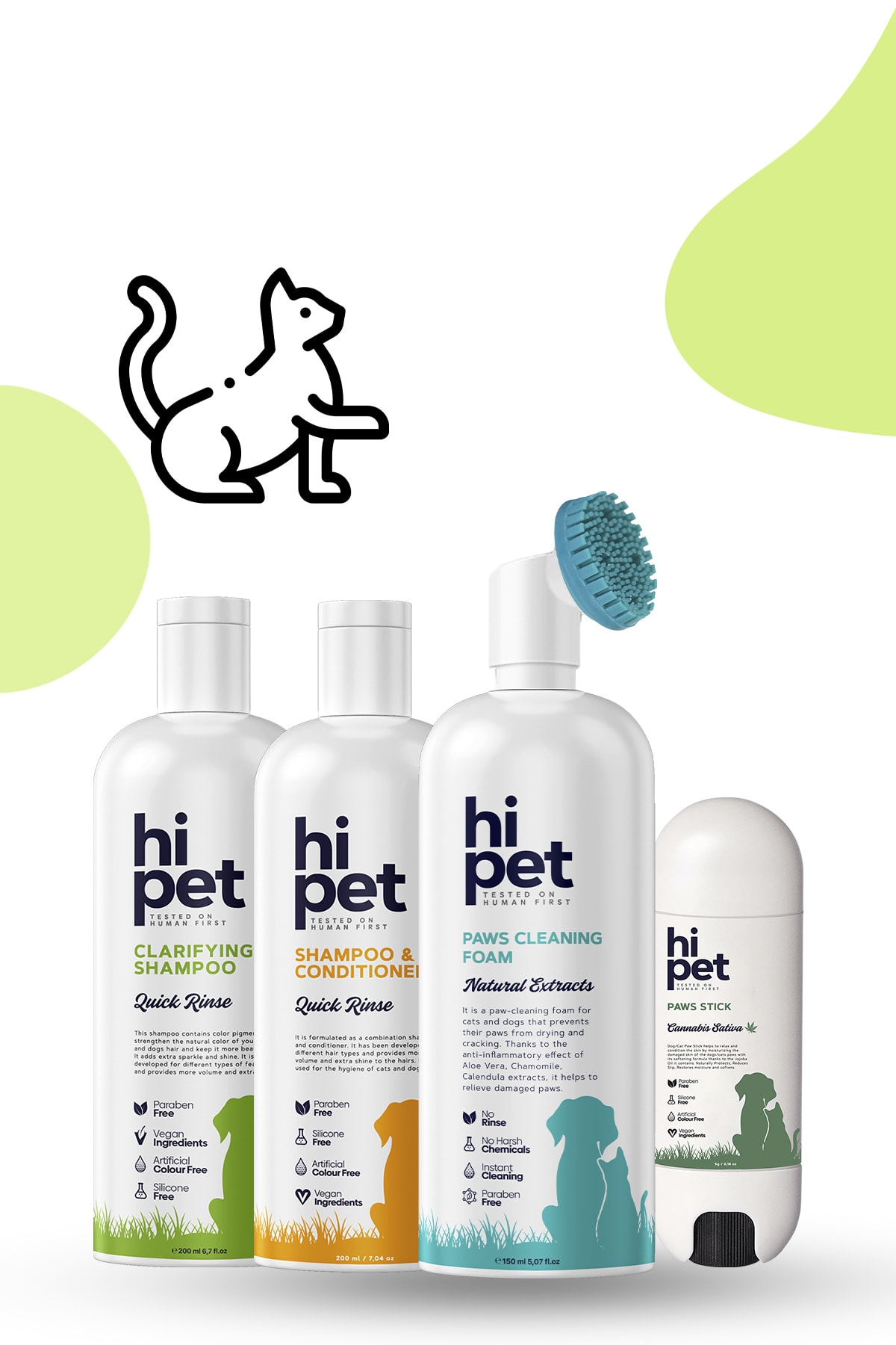 Would you like to complete all your furry friend's cleaning and care with a single set?With the Deep Cleaning and Care Set, you can clean your furry friend's skin, fur, and paws, and keep them looking great with its care and maintenance effect. Purifying Shampoo:Made from fermented plant oils, HiPet Purifying Shampoo (200 ml) helps cats and dogs maintain healthier coats. While providing a deep cleansing of the skin and coat during bathing, the aloe vera extract it contains nourishes and moisturizes the coat. It prevents problems such as dermatitis, eczema, and flea allergies. If you want your pet's coat to look healthy and clean, HiPet Purifying Shampoo is for you. Conditioning Shampoo: Do you want your furry friends to look their best? Specially designed for your cat and dog friends, HiPet Conditioning Shampoo (200 ml) cleans fur from root to tip, leaving it smelling fresh, while also giving it a shiny, bright, and healthy appearance. Thanks to its specially formulated pet formula consisting of shampoo and conditioner, you can reduce shedding and make grooming easier for your fur. Paw Cleaner Foam:Dirty paws are no longer a problem after a walk with your pet. Specially designed for dog and cat paws, HiPet Paw Cleaner Foam (150 ml) removes even the toughest dirt thanks to its silicone tip. Thanks to the coconut oil in its formula, it leaves your pet's paws moisturized and shiny. Cannabis Paw Stick: HiPet Cannabis Stick (5 gr.) is an organic pet product specially formulated to repair the damage caused to the paws of cats and dogs. Thanks to the natural shea butter it contains, it instantly repairs and cares for dryness, cracks, and wounds on your pet's paws. Its soothing properties ensure your little friend's peace of mind during the healing process. Deep Cleaning, Complete Care: 1-Apply the Paw Cleansing Foam to the paw by lightly pressing the applicator once and spreading it. Wipe it off with a dry paper towel or cloth. 2-Apply the Purifying Shampoo to the coat and massage from the neck down until it begins to lather. Then rinse thoroughly with clean, warm water. 3-Apply Conditioning Shampoo to damp fur and massage down from the neck until it begins to lather. 4-Then rinse thoroughly with clean, warm water and dry the fur with a towel or hair dryer, combing the damp fur thoroughly. 5-Apply Cannabis Paw Stick by massaging between your fur's toes and paw area, thoroughly covering the area. Leave a light layer of protection and let it absorb. |