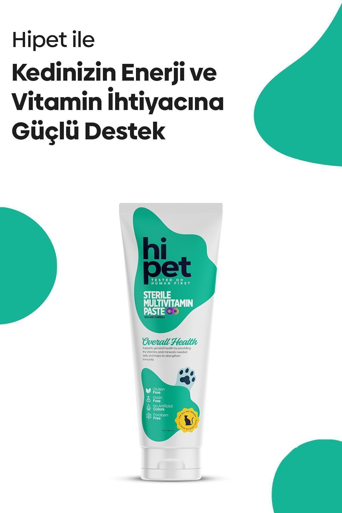HiPet Multivitamin Pasta, kedilerde görülebilecek vitamin eksikligi belirtilerini önleyerek genel sagligi destekler. Içerigindeki zengin besin maddeleri ile enerji seviyesini artirir, ve tüy sagligini destekler. Düzenli kullanimda patili dostunuzun daha saglikli ve mutlu bir yasam sürmesine yardimci olur.HiPet Multivitamin Kedi Malti nasil kullanilir, evcil hayvan bakimi nasil yapilir? Ürünün kapagini açin.Kullanmadan önce dostunuza hafifçe koklatin. Yetiskin kediler için 2 gr (4 cm) olacak sekilde ürünü mamasina sikin. Alternatif olarak tüpten sikarak ya da patisine sürerek kullanabilirsiniz.