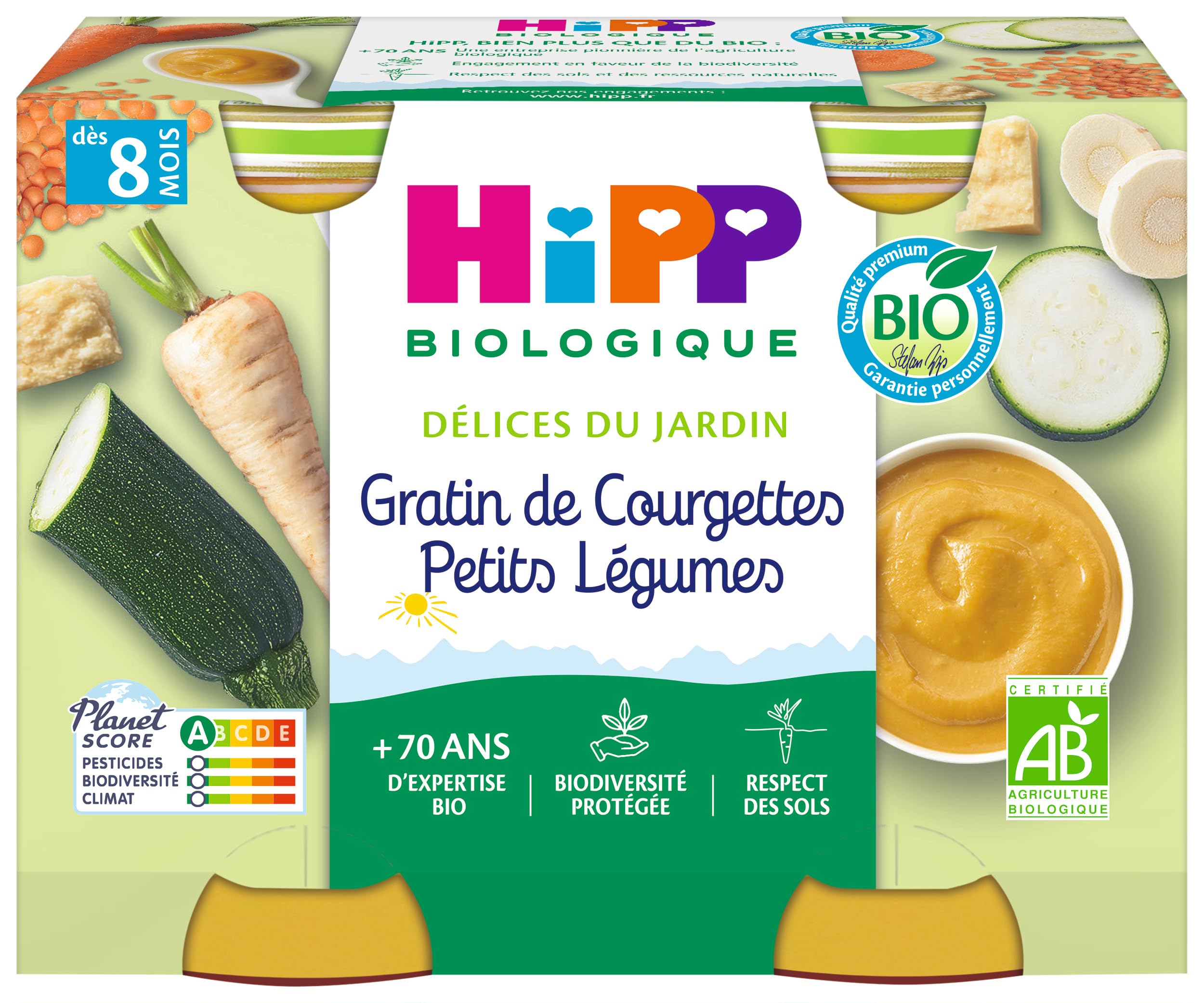 : Discovering Taste. After introducing Baby to their first vegetables, and to enrich their taste experience, HiPP Organic offers a variety of vegetable recipes, Garden Delights. ? Organic vegetables harvested at peak ripeness and steamed to preserve their flavor and nutrients, ? Rapeseed oil rich in essential omega-3 fatty acids (alpha-linolenic acid), to contribute to the healthy development of the brain and nervous system. Ingredients: Cooking water, carrots 20 , zucchini 15 , parsnips 12 , onions , red lentil flour 5 , rice flour , cheddar cheese 3.0 , rapeseed oil 1.5 . Products from Organic Farming. Gluten-free. May contain mustard. P.when('A').execute(function(A) { A.on('a:expander:toggle_description:toggle:collapse', function(data) { window.scroll(0, data.expander. expander[0].offsetTop-100) }) }) Instructions for Use: Before opening, store at room temperature. Unheated and tightly closed, the product can be kept for 24 hours in the refrigerator. Safety Warning: Before consumption, ensure that the jar and lid are still intact. Vacuum-packed product with a safety lid: the safety lid should click upon first opening. Heat the opened jar in a bain-marie or microwave. Stir and check the temperature! Tip: Please do not use a metal spoon to avoid damaging the glass jar. See moreConvenient format: pack of 2 jars of 190g each, packaging suitable for baby's meals and easy to store. Enriched with rapeseed oil: rich in essential omega-3 fatty acids to contribute to the healthy development of your baby's brain and nervous system. Organically grown vegetables: harvested at peak ripeness and steamed to preserve their flavor and essential nutrients. Organic quality: organic vegetable puree suitable for children for a healthy diet. Pure formula: no preservatives, no colorings, no added flavorings, no added salt to respect your baby's health. Natural composition: no added salt, gluten-free, smooth texture suitable for babies from 8 months.Description du produit A la découverte du goût Après l'initiation de Bébé aux premiers légumes et pour enrichir son expérience gustative, HiPP Biologique propose des recettes de légumes variés, les Délices du Jardin. ? des légumes bio récoltés à maturité et cuits à la vapeur pour préserver leurs goûts et leurs nutriments, ? de l'huile de colza riche en acides gras essentiels oméga 3 (Acide alpha-linolénique), pour contribuer au bon développement du cerveau et du système nerveux. Ingrédients Eau de cuisson, carottes 20 , courgettes 15 , panais 12 , oignons , farine de lentilles corail 5 , farine de riz ,fromage cheddar 3,0 , huile de colza 1,5 Produits issus de l'Agriculture Biologique Sans gluten. Peut contenir de la moutarde P.when('A').execute(function(A) { A.on('a:expander:toggle_description:toggle:collapse', function(data) { window.scroll(0, data.expander. expander[0].offsetTop-100) }) }) Mode d'emploi Avant ouverture, conserver à température ambiante. Le produit non réchauffé et bien refermé se conserve 24 heures au réfrigérateur. Avertissement De Sûreté Assurez-vous avant la consommation que le pot et la capsule sont toujours intacts. Produit conditionné sous vide avec capsule de sécurité : la capsule de sécurité doit cliquer à la première ouverture. Réchauffez le pot ouvert au bain-marie ou au micro-ondes. Remuez et vérifiez la température ! Un conseil : veuillez ne pas utiliser de cuillère en métal pour éviter d'endommager le pot en verre. Voir plusFormat pratique: lot de 2 pots de 190 g chacun, conditionnement adapté pour les repas de bébé et facile à conserver. Enrichi en huile de colza: riche en acides gras essentiels oméga 3 pour contribuer au bon développement du cerveau et du système nerveux de bébé. Légumes cultivés biologiquement: récoltés à maturité et cuits à la vapeur pour préserver leurs goûts et leurs nutriments essentiels. Qualité biologique: purée de légumes biologique adaptée à l'enfant pour une alimentation saine. Formulation pure: sans conservateurs, sans colorants, sans arômes ajoutés, sans sel ajouté pour respecter la santé de bébé. Composition naturelle: sans sel ajouté, sans gluten, texture lisse adaptée aux bébés dès 8 mois.HiPP - Délices du Jardin - Gratin de Courgettes Petits Légumes Dès 8 Mois - Pots - 2x190 g - BIOLOGIQUE