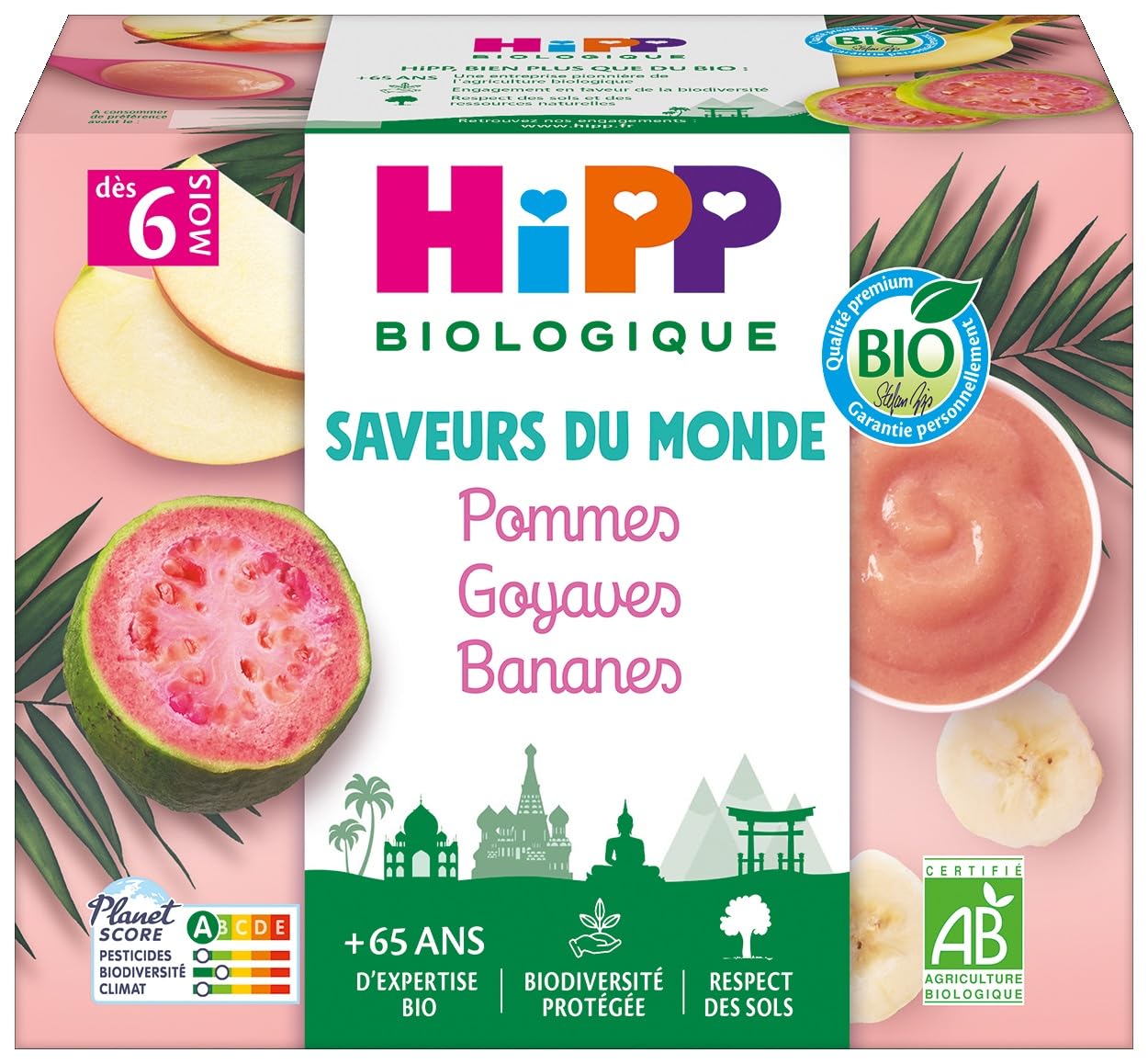 DESCRIPTION DU PRODUIT DESCRIPTION DU PRODUIT Un tour du monde des saveurs Les coupelles Saveurs du Monde offrent un moment d'évasion à Bébé grâce à des recettes aux fruits exotiques : ? des fruits bio cueillis à maturité, ? une cuisson douce afin de préserver au mieux leurs qualités nutritionnelles et leurs goûts, ? sans sucres ajoutés. Les purées de fruits HiPP sont délicieuses fraîches ou à température ambiante, en dessert ou pour le goûter. 1 coupelle de fruits HiPP 1 portion de fruits INGRÉDIENTS Fruits 100 (pommes 60 , purée de goyave 20 , bananes 20 ). Produits issus de l'Agriculture Biologique Naturellement sans gluten