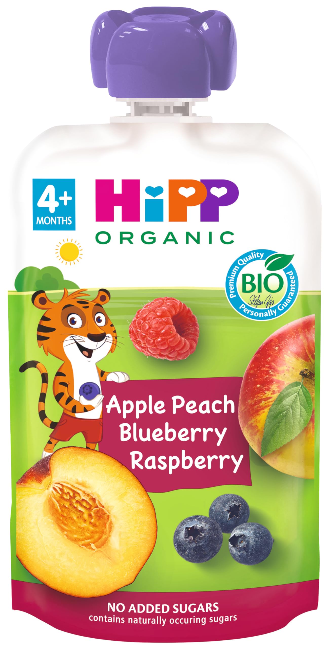 HiPP Organic - Multi-Fruit Pouch - Organic Peach, Apple, and Forest Fruit Tiger Pouches - 100g - No Added Sugar - Suitable from 4 Months. Good nutrition is essential for children's development. Formulated with 100 organic and non-GMO (genetically modified organism) ingredients. The fruits are not acidic and are gentle for babies. Contains no added sugars. The taste is natural because HiPP does not alter it. INGREDIENTS 100 Fruit (apple 73 , peach 16 , blueberry 6 , raspberry 5 ) Organically grown. INSTRUCTIONS FOR USE Consume as is. See more