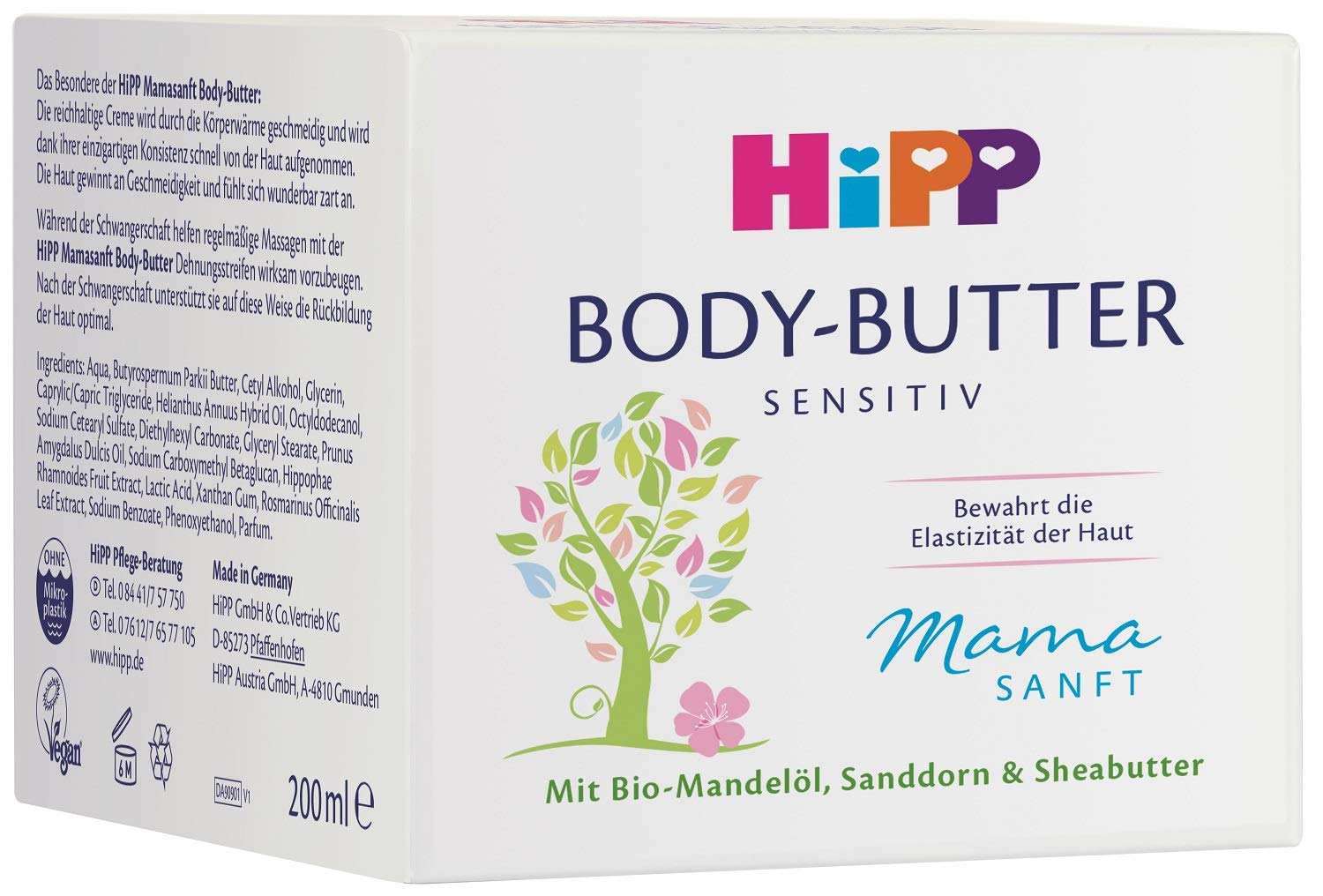 The combination of high-quality shea butter, soothing almond oil and valuable sea buckthorn oil relaxes and maintains the skin intensely.The Hipp Mamasanft Body butter is specially tailored to the needs of stressed skin - especially during and after pregnancy.The skin gains smoothness and feels wonderfully delicate.Developed to minimize allergy risks.The rich cream becomes smooth due to body heat and is quickly absorbed by the skin thanks to its unique consistency.