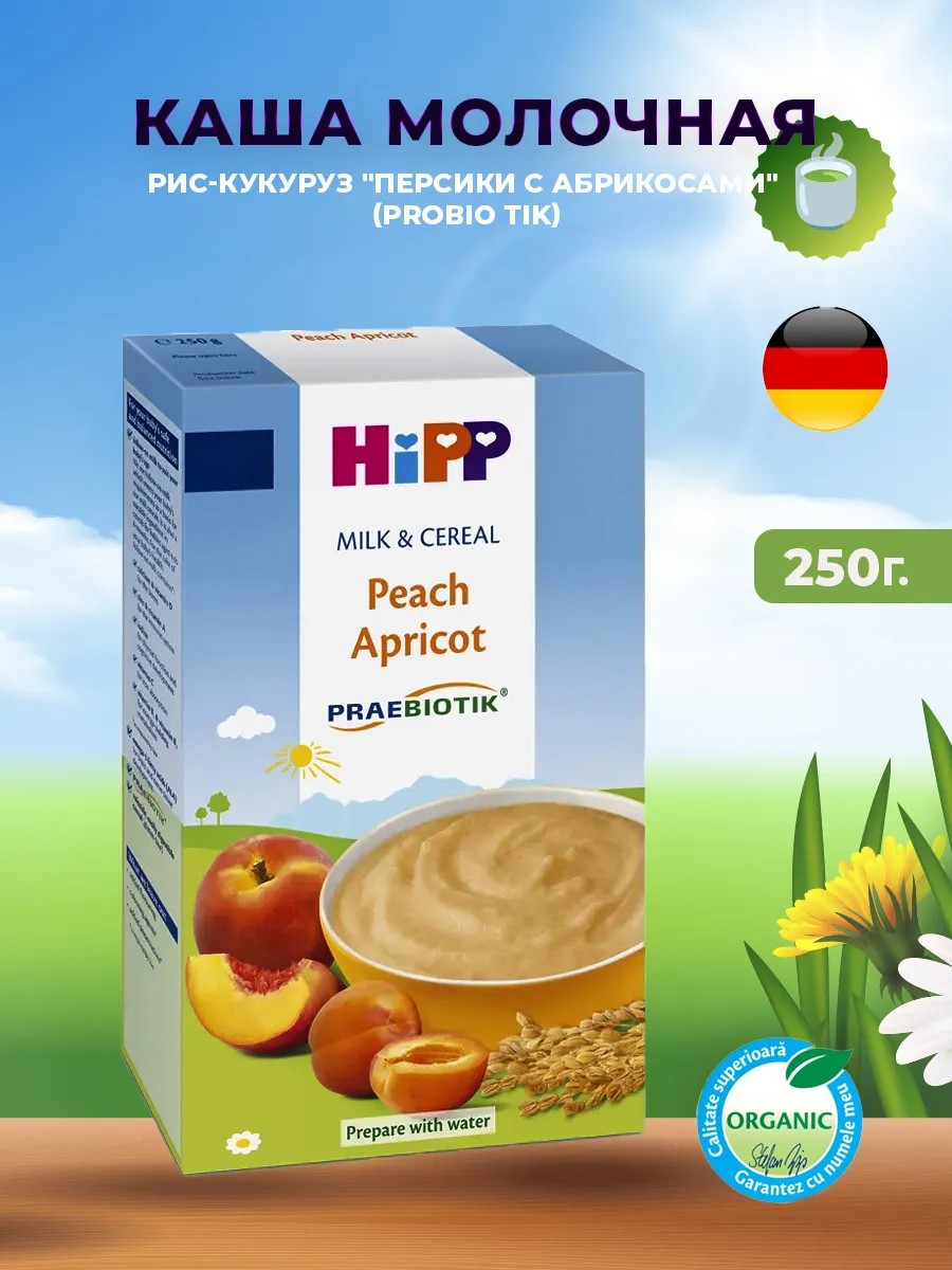 каша молочная рисово-кукурузная с персиком и абрикосом (probio tik) — органический продукт для детей с 4 месяцев. сочетает полезные злаки и фрукты, обогащена пребиотиками и витаминами, поддерживает здоровое пищеварение и развитие малыша.