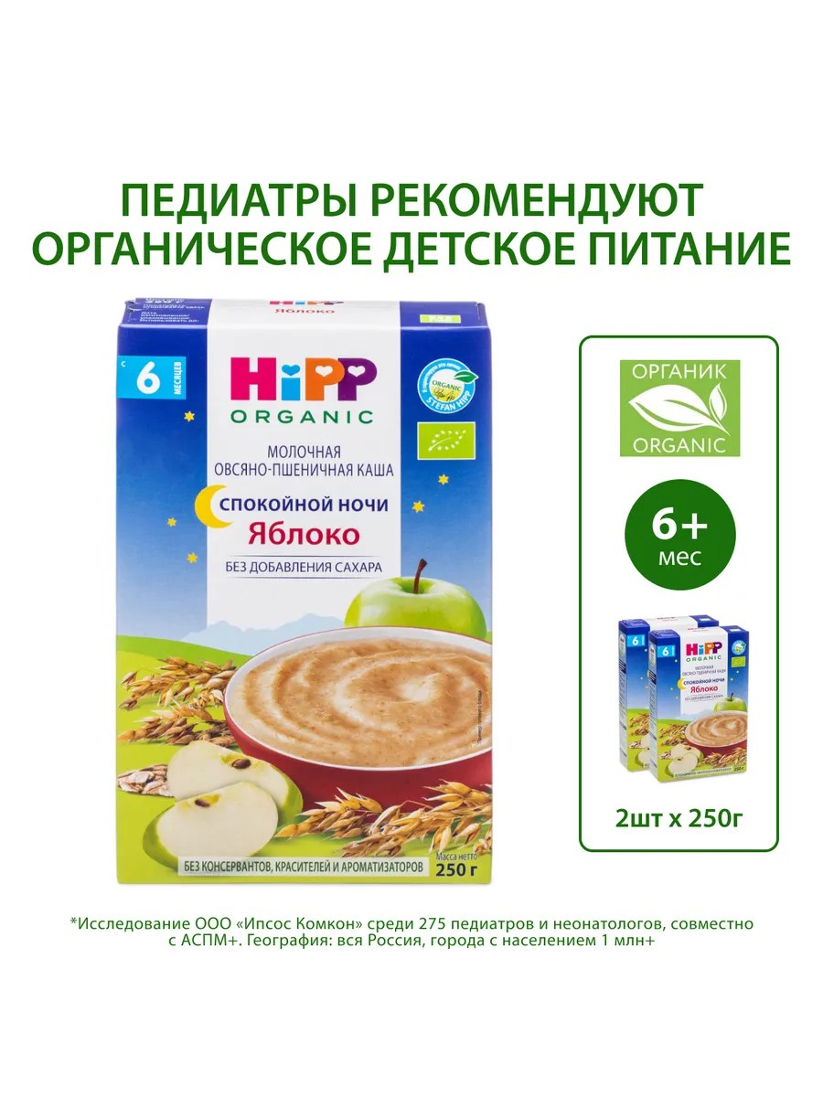 Каша детская молочная органическая овсяно-пшеничная с яблоком HiPP «Спокойной ночи» откроет для малыша новое сочетание вкусов и разнообразит меню.