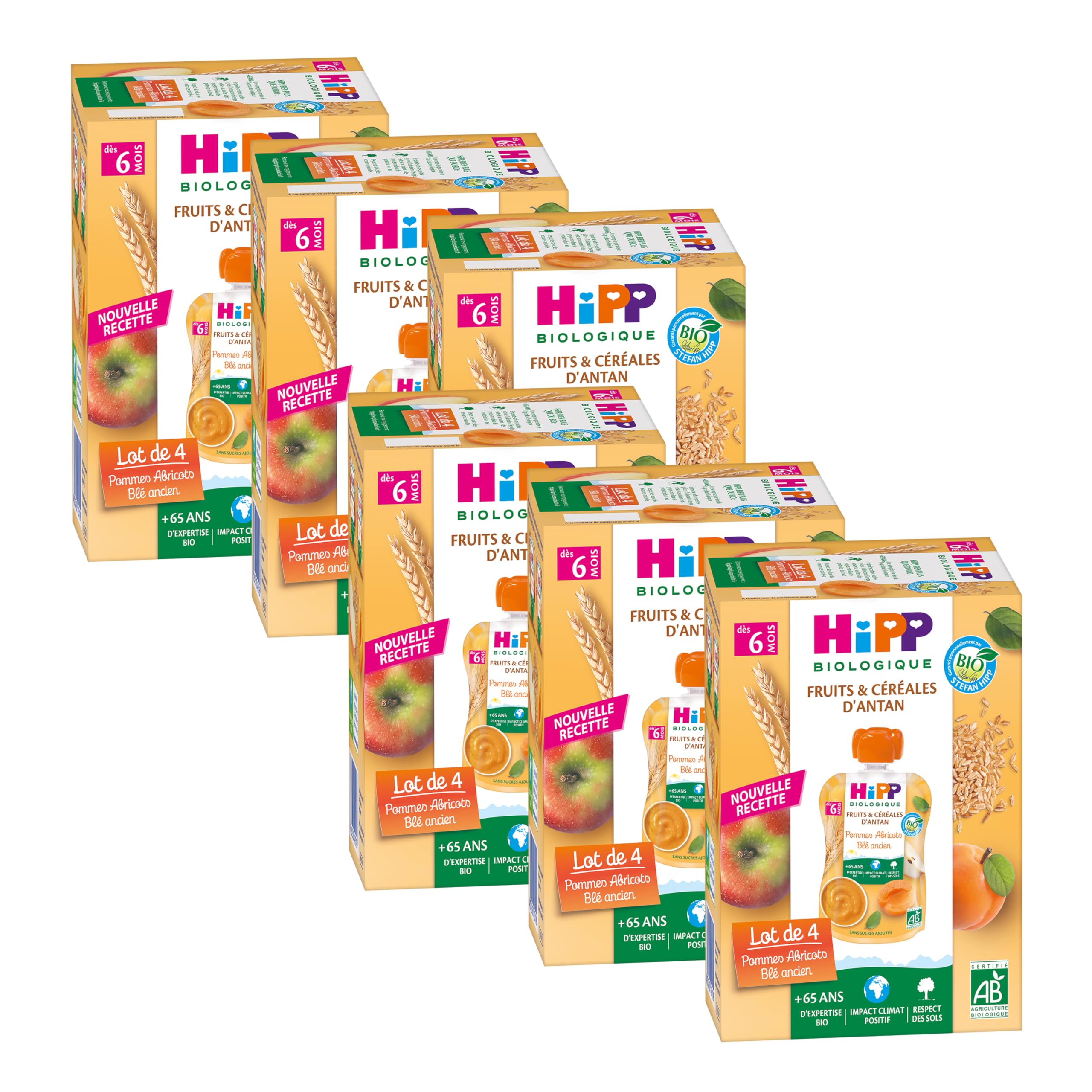 Delicious fruit and cereal purees in a bottle Les Fruits et Céréales d'Antan are delicious fruit purees cooked with ancient wheat or spelled, for a tasty snack and a perfect nutritional balance. HiPP fruit bottles offer your baby the best that nature has to offer: organic fruits picked when ripe, organic ancient cereals with a subtle hazelnut aroma, without added sugars. IN PROGRESS - message validated? ----- OUR NEW GENERATION OF BOTTLE The first recyclable bottle on the infant food market, Made from a single recyclable material, To be thrown into the sorting bin with its cap. ------ IN PROGRESS INGREDIENTS Fruits 73 (apples 50 , apricots 15 , bananas ), cooking water, whole grain flour 4 , whole wheat flour 1.5 , antioxidant: ascorbic acid. Products from Organic Farming All allergens are indicated in CAPITALS DIRECTIONS FOR USE Directions for use: Gently squeeze into a spoon or let Baby eat directly from the bottle if he is ready. Serve chilled or at room temperature. SAFETY WARNING Attention! Do not let your baby suck for too long to avoid the development of cavities on their baby teeth. After opening, put the cap out of reach of the child. Do not leave children under 36 months with the cap unsupervised. Remember to brush Baby's teeth. Package weight: 2.16 kilograms. Organic fruit puree suitable for children. Apples, Apricots, Ancient Wheat. Complies with regulations governing infant nutrition. Contains naturally occurring sugars. No preservatives - No colorings - No modified starches - No added flavors - No added sugars. No added sugars. De délicieuses purées de fruits et céréales en gourde Les Fruits et Céréales d'Antan sont de délicieuses purées de fruits cuisinées avec du blé ancien ou de l'épeautre, pour un goûter savoureux et un parfait équilibre nutritionnel. Les gourdes de fruits HiPP offrent à votre bébé ce que la nature a de meilleur avec : des fruits bio cueillis à maturité, des céréales anciennes bio avec un subtil arôme de noisette, sans sucres ajoutés. EN COURS - message validé? ----- NOTRE NOUVELLE GENERATION DE GOURDE La première gourde recyclable du marché de l'alimentation infantile, Faite à partir d'un mono-matériau recyclable, A jeter dans la poubelle de tri avec son bouchon. ------ EN COURS INGRÉDIENTS Fruits 73 (pommes 50 , abricots 15 , bananes ), eau de cuisson, farine complète d'ENGRAIN 4 , farine complète de BLE 1,5 , antioxygène : acide ascorbique. Produits issus de l Agriculture Biologique Tous les allergènes sont indiqués en MAJUSCULES MODE D'EMPLOI Conseils d'utilisation : Presser doucement dans une cuillère ou laisser Bébé manger directement à la gourde s'il est prêt. Servir frais ou à température ambiante. AVERTISSEMENT DE SÛRETÉ Attention! Ne pas laisser Bébé sucer trop longtemps afin d éviter le développement de caries sur ses dents de lait. Après ouverture, mettre le bouchon hors de portée de l enfant. Ne pas laisser les enfants de moins de 36 mois avec le bouchon sans surveillance. Pensez à brosser les dents de Bébé. Poids du colis: 2.16 kilogrammes. Purée de fruits biologique adaptée à l enfant. Pommes Abricots Blé ancien. Conformément à la réglementation sur l'alimentation infantile. Contient des sucres naturellement présents. sans conservateurs - sans colorants - sans amidons modifies - sans arômes ajoutés - sans sucres ajoutés. sans sucres ajoutés.
