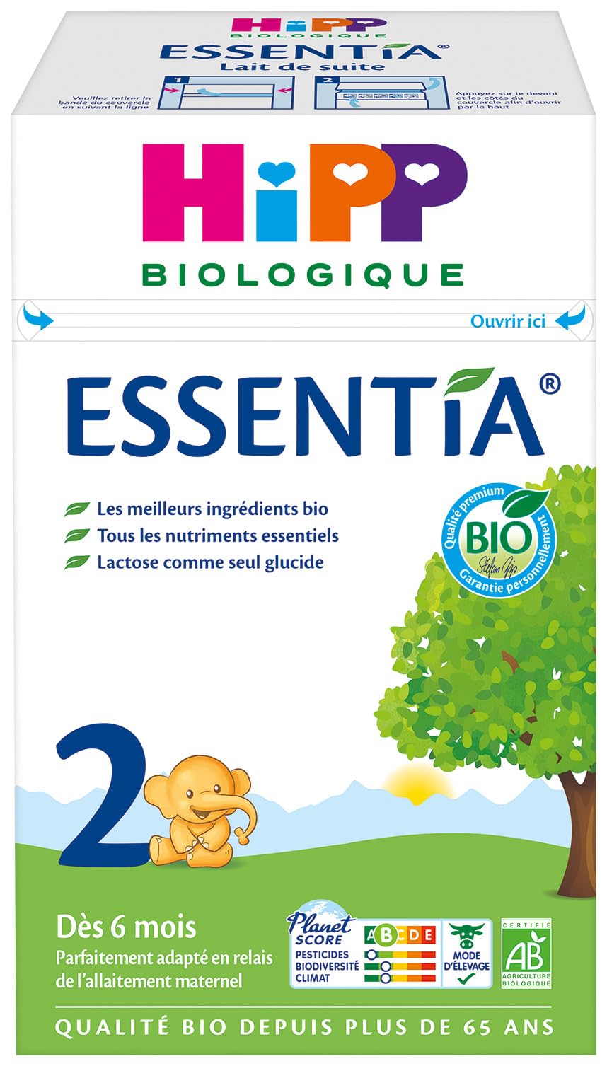 HiPP, expert in infant formula for 50 years Why choose HiPP 2 Essentia Milk? Our latest generation of HiPP 2 Essentia Follow-on Milk contains carefully selected organic ingredients: ✓ Organic milk from cows fed with untreated, non-GMO grass and fodder ( DIRECTIONS FOR USE IMPORTANT USAGE ADVICE: Any improper preparation or storage of this product may harm your baby's health. Strictly respect the following advice: ✓ Wash your hands before each preparation. ✓ Always use a clean bottle, pacifier and ring. ✓ Use bottled water suitable for infants (indicated on the label) or cold tap water. ✓ Boil and let cool to 40-50 C or room temperature. ✓ Pour the recommended amount of water into the bottle (see dosage). ✓ Add the number of leveled scoops needed (1 scoop for 30ml of water). ✓ Close the bottle and shake it vigorously by rolling it between the palms of your hands, first horizontally then vertically. ✓ Check the temperature before consuming by pouring a drop onto your wrist. It's ready! DOSAGE: Every baby is different. The quantities and frequency of bottles recommended above are for information only. Refer to the recommendations of the medical profession. Always use 1 scoop for 30 ml of water. One level scoop 4.4 g of HiPP 2 Essentia powder. To be consumed as part of a varied and balanced diet and a healthy lifestyle. SAFETY WARNING Important information • Never prepare a bottle in advance, consume immediately and absolutely throw away unfinished leftovers. • Use only the scoop contained in this box. • Respect the dosage indicated in the table. • Do not reheat in the microwave (risk of burns). • Check the product's expiration date ("Exp. Date") on the bottom of the box. After opening, the tightly closed box can be kept for 3 weeks in a cool, dry place. Important notice Breastfeeding is best for your child. It provides him with everything he needs for his harmonious development. Like any follow-on food, HiPP 2 Essentia Follow-on Milk cannot be used as a substitute for breast milk during the baby's first six months, but after six months as part of a diversified diet. After consultation with a health or early childhood professional, HiPP 2 Essentia Follow-on Milk can however be introduced beforehand, in addition to a diversified diet. To prevent the appearance of cavities, clean your child's teeth regularly. Never let your child use the bottle for prolonged feeding and teach him to drink from a cup as early as possible. Fashion. Accessories. Computers. HiPP, expert des préparations infantiles depuis 50 ans Pourquoi choisir le Lait HiPP 2 Essentia ? Notre dernière génération de Lait de suite HiPP 2 Essentia contient des ingrédients biologiques soigneusement sélectionnés : ✓ Du lait bio issu de vaches nourries avec de l'herbe et des fourrages non traités et sans OGM ( MODE D'EMPLOI CONSEIL D'UTILISATION IMPORTANT : Toute préparation ou conservation inadéquate de ce produit peut nuire à la santé de votre bébé. Respectez scrupuleusement les conseils suivants : ✓ Lavez-vous les mains avant chaque préparation. ✓ Utilisez toujours un biberon, une tétine et une bague propres. ✓ Utilisez de l'eau en bouteille adaptée aux nourrissons (indiqué sur l'étiquette) ou de l'eau froide du robinet. ✓ Faites bouillir et laissez refroidir à 40-50 C ou à température ambiante. ✓ Versez la quantité d eau recommandée dans le biberon (voir dosage). ✓ Ajoutez le nombre de mesurettes arasées nécessaires (1 mesurette pour 30ml d eau). ✓ Fermez le biberon et agitez-le vigoureusement en le faisant rouler entre les paumes de vos mains, d'abord horizontalement puis verticalement. ✓ Contrôlez la température avant de faire consommer en versant une goutte sur votre poignet. C'est prêt ! DOSAGE : Chaque bébé est différent. Les quantités et la fréquence des biberons recommandées ci-dessus le sont à titre indicatif. Reportez-vous aux recommandations du corps médical. Utilisez toujours 1 mesurette pour 30 ml d'eau. Une mesurette arasée 4,4 g de poudre HiPP 2 Essentia. A consommer dans le cadre d'une alimentation variée et équilibrée et d'un mode de vie sain. AVERTISSEMENT DE SÛRETÉ Informations importantes • Ne préparez jamais de biberon à l'avance, consommez immédiatement et jetez impérativement les restes non terminés. • Utilisez exclusivement la mesurette contenue dans cette boîte. • Respectez le dosage indiqué dans le tableau. • Ne réchauffez pas au four à micro-ondes (risque de brûlure). • Vérifiez la date de péremption du produit ("Exp. Date") sur le dessous de la boîte. Après ouverture, la boîte bien fermée peut se conserver 3 semaines dans un endroit frais et sec. Avis important L'allaitement maternel est ce qu'il y a de meilleur pour votre enfant. Il lui apporte tout ce dont il a besoin pour son développement harmonieux. Comme tout aliment de suite, le Lait de suite HiPP 2 Essentia ne peut être utilisé comme substitut du lait maternel au cours des six premiers mois de bébé, mais après six mois dans le cadre d'une alimentation diversifiée. Après consultation d'un professionnel de santé ou de la petite enfance, le Lait de suite HiPP 2 Essentia peut cependant être introduit avant, en complément d'une alimentation diversifiée. Afin de prévenir l'apparition des caries, lavez les dents de votre enfant régulièrement. Ne laissez jamais votre enfant utiliser le biberon pour une tétée prolongée et apprenez-lui à boire dans une tasse le plus tôt possible. Mode. Accessoires. Informatique.
