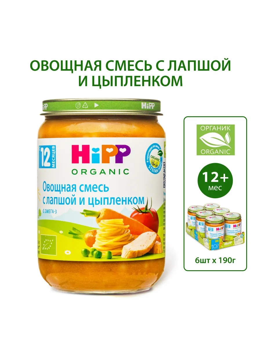 Мясо-овощное пюре "Овощная смесь с лапшой и цыпленком" HiPP - это продукт высшего качества: